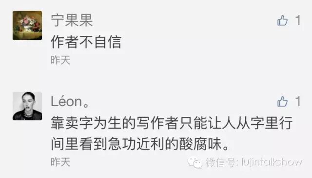 第三条有关急功近利和酸腐,我不得不说,越喜欢说别人功利和酸腐的人越功利越酸腐。有人说你有本事让书店不许看书啊,就是有那么多人坐一天看了不买啊!嗯,我没这个本事,但每一个作者都充满伤感地看着这一幕。那些只看不买的人,那些拿了三张身份证一借借六十本的难道都是穷到拿不出钱买一本书吗?我平时每天回家吃饭,周末自己在家烧饭吃,觉这得下馆子比较贵,而这些人中的一部分很可能平时不做饭,天天下馆子呢!他们会花几百上千买一件衣服,几千块买个包,但就是不愿意花钱买哪怕想看的书,能不买就不买。这和穷不是一一对应的关系,他们根本就是没有同理心,尊重和支持创作。昨天的文章中有一位经常给我赞赏,虽然每次都是一元二元的读者,她说她一个每月只赚两千元,但她认为应该对喜欢的文字表达尊重。我给她留言了,我说在现阶段希望她不要再赞赏了,她已经让我非常感动,我觉得这是一种精神的高贵,作者和这样的读者之间是惺惺相惜的,情怀也是由此产生的。而往往不付出的人经常会指责别人功利,这个帽子扣得好爽啊,你啥也不做就占据了道德制高点。你要求勤奋工作的人不要计较,否则就是功利,这样可以让你这样的人不仅仅安心不劳而获还可以一边享受你的成果,一边说你是本烂书。你是人吗?