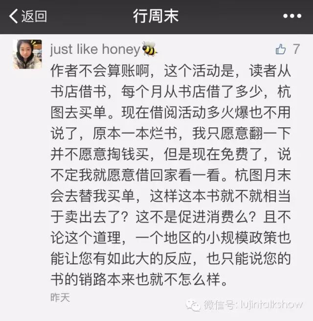 第一点熟悉我的人都知道,这种情况在我身上是不可能发生的。这又不是一条特复杂的新闻,写文章前我当然会搞清楚前因后果。我知道是图书馆和书店的合作,意思是把采购权交给读者。但事实上还是会给作者造成损害。去书店的人本来翻两页觉得这书值得买就会买,回家慢慢看,要是翻两页不用付钱就可以借回家,他为什么还要买呢?这个悦读服务计划把图书馆的功能扩大到了书店,破坏了市场原则。也许还是会有人买书,但本来可以卖二十本的书可能就只能卖出去两本了。对于作者来说,图书馆的做法是伤害写作者的。