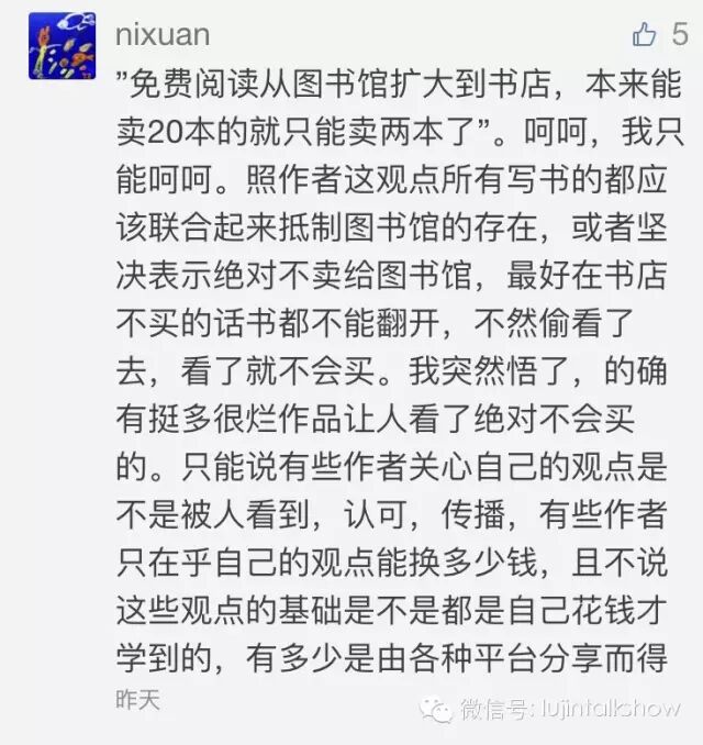 第二条有关烂书才会受影响。一是烂书也有权利就像丑八怪也有人权,我愿意送人是我愿意,出版社觉得没指望了卖不出去了想卖废纸是他们的权利,但你图书馆不能把手伸到书店。这就好比家里的沙发电视,你不想要你可以自己处理,扔了或者砸了,但别人不能不经你同意到你家去拿。你买下的书放在图书馆让人免费阅读没问题,但我的书放在书店是卖的,你不能像个大亨似的说:乡亲们,随便拿,我买单!可又不是拿回家看的都买单,你说了看完了还可以给别人看,得!本来十个人要买的,这下都不付钱了。你要豪迈回馆里豪迈去,书店不是你的地盘。还有说是培养阅读习惯,超市也很想培养你的消费习惯呢,商场也想培养你的消费习惯呢,你怎么不能在那儿拿了就走啊!