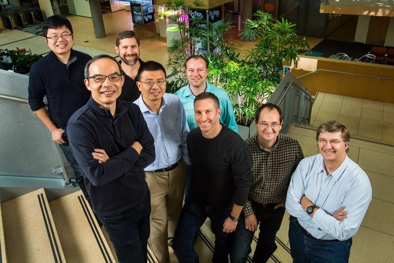 后排左起:Wayne Xiong, Geoffrey Zweig, Frank Seide;前排左起:黄学东, Dong Yu,