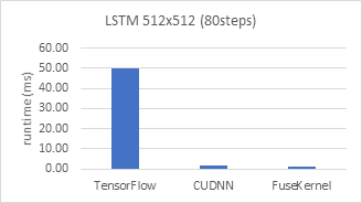 为了展示内核融合能够带来的好处,我们对比了一个80步长的单样本LSTM网络在TensorFlow上的模型推理(inference)时间和我们手工将所有计算融合并优化在同一个内核函数中的计算时间(图1)。可以看出,在相同的GPU上,融合的内核函数比TensorFlow上基于图的计算可以快40倍左右。当然,这里的TensorFlow与手动融合的内核的性能差距除了来源于上述性能开销外,还包括TensorFlow本身的框架开销。