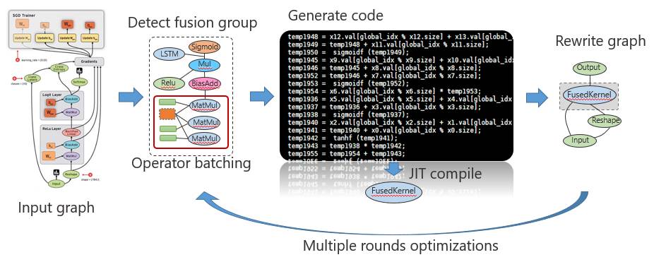 然而,为每一个计算图的内核函数进行手工融合并不是一种可以扩展的方法。因此,研究自动化的内核融合成为最近的一个热点,例如TensorFlow中的XLA项目就是要将给定的计算图生成硬件设备相关的机器码,再如NNVM-Fusion是DMLC社区为加速MXNet所提出的相关项目,还有最近比较流行的动态图计算框架PyTorch也开始逐渐引入内核融合的技术来提升性能。
