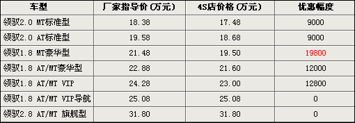 上表显示,领驭五款车型中优惠的幅度最大的为1.8T手动豪华版,这款车型除了有近2万元的现金优惠外还4S店还赠送价值3000元的大礼包,其他车型的优惠也在万元左右,而且几家经销商均表示此优惠价格是提裸车的价格。据经销商介绍1.8T VIP导航版和2.8旗舰型销量较小,价格上没有优惠,而且店内一般没有现车,消费者购买只能预定,等待时间两周左右,订金1000-3000元不等。http://www.hexun.com/Images/30/42/304218.gif