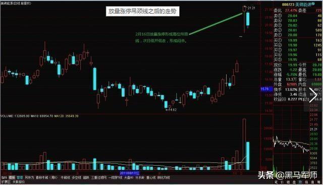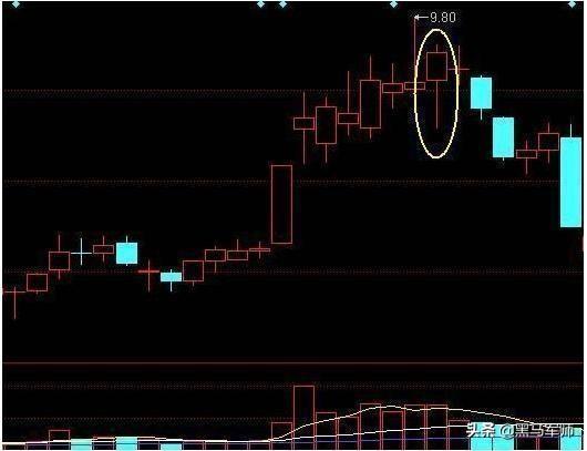3.股价在连续拉升之后出现阳吊顶线,股价见顶回落。