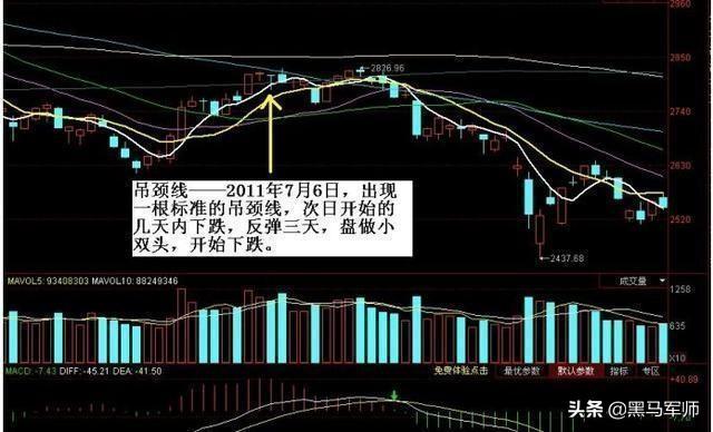 2、上吊线出现后的第二根K线一般为阴线,阴线的长度越长,新一轮跌势开始的概率就越大。