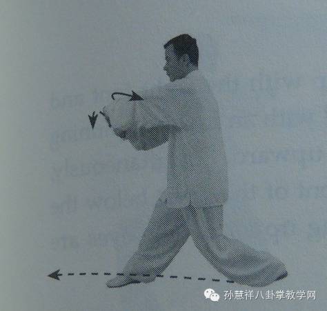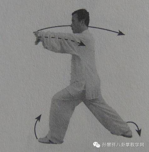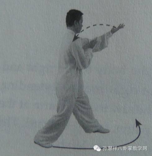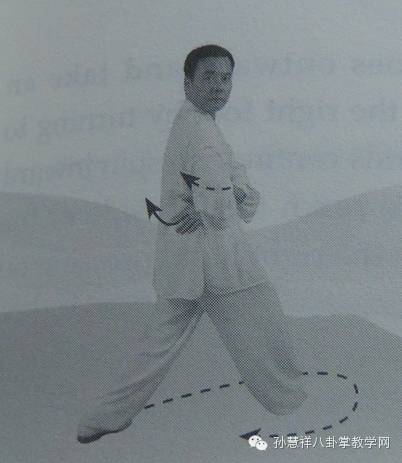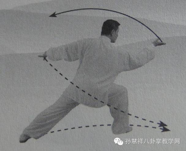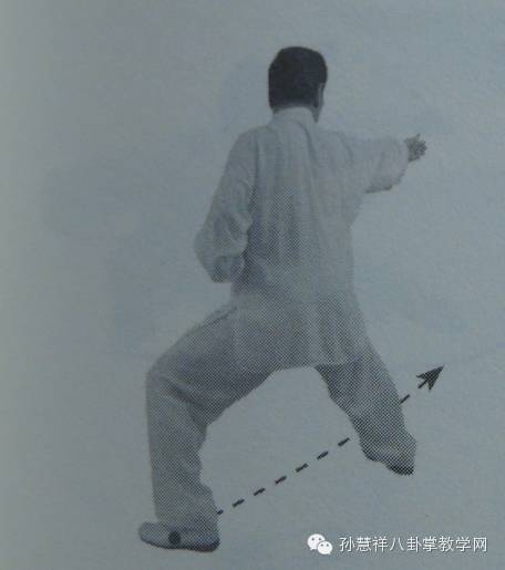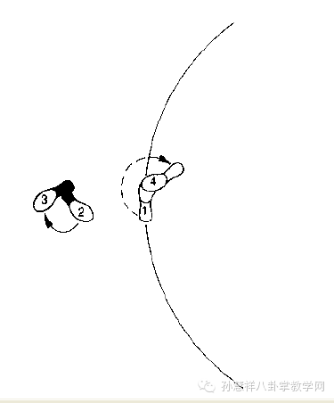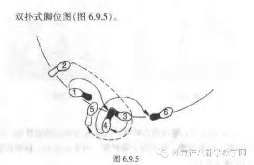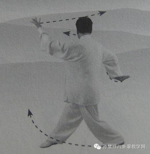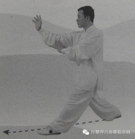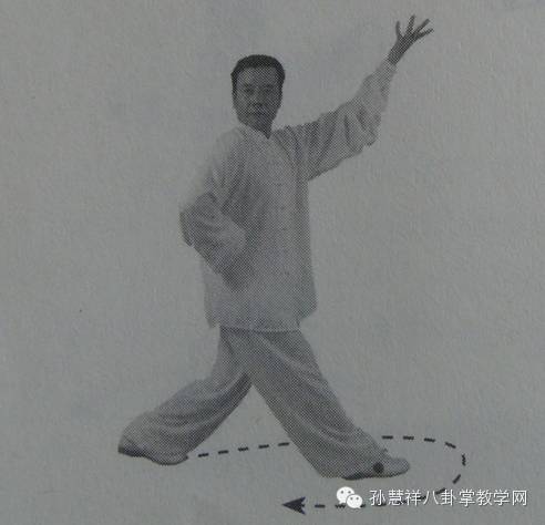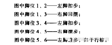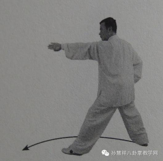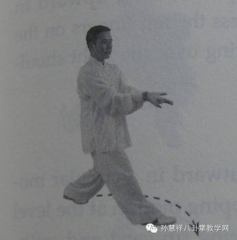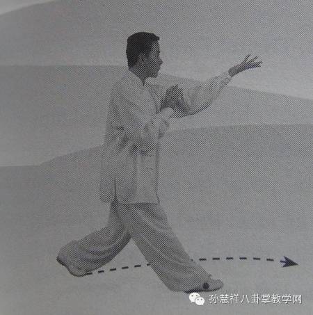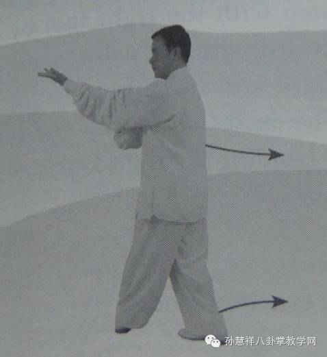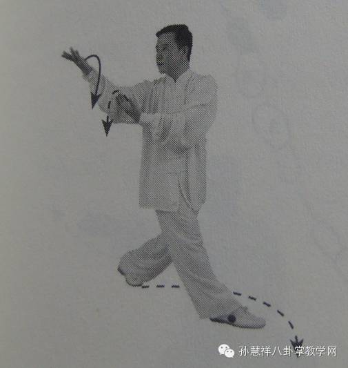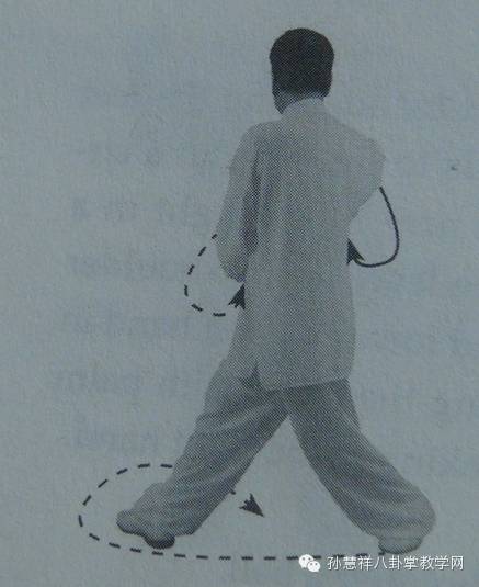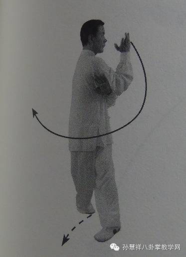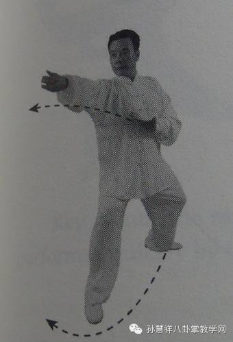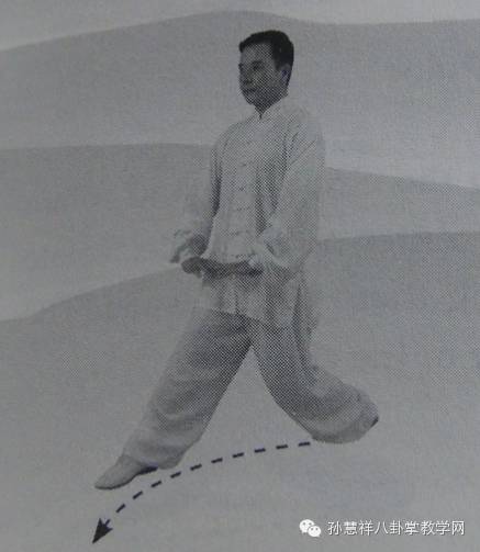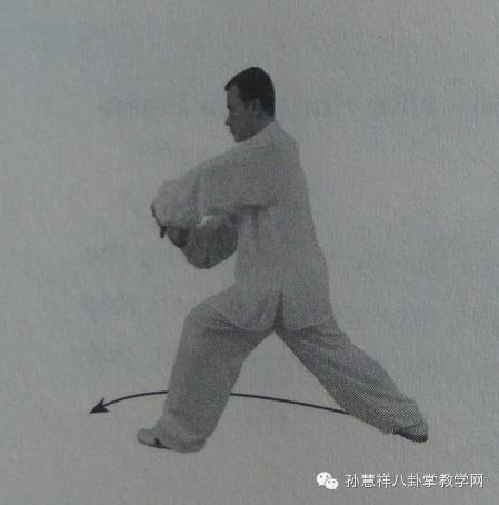左脚(圈外脚)进步,平扣步,左脚横于右脚前.右脚尖对准左横脚的中心方向.两脚成90度(丁字型)。上身姿势不变(图6.2.1)。