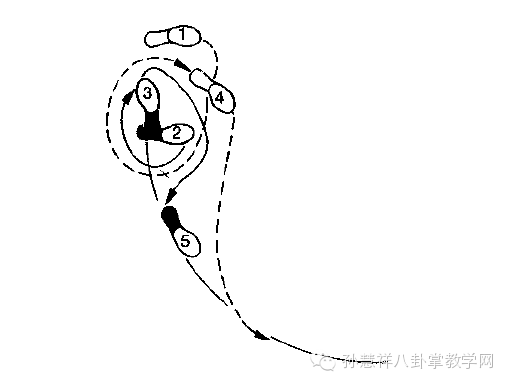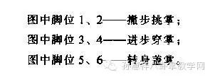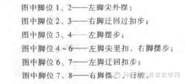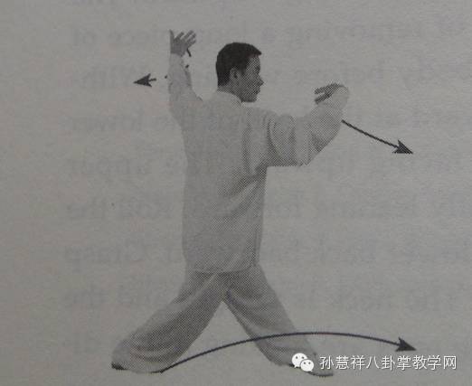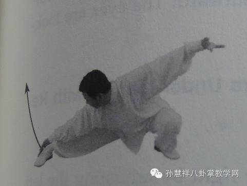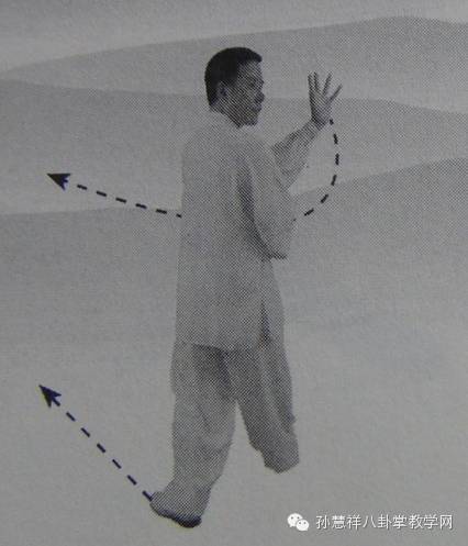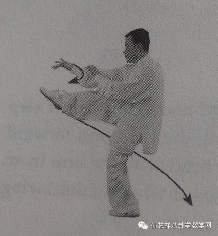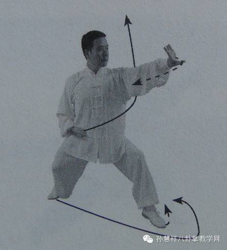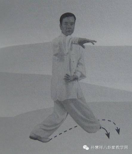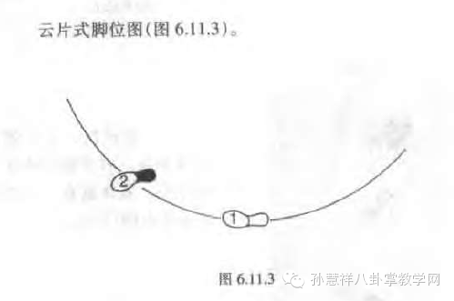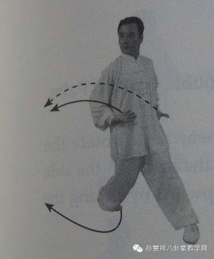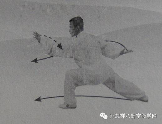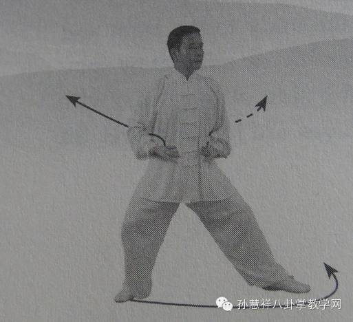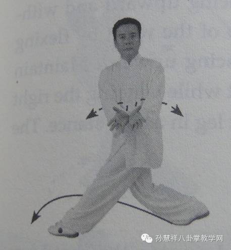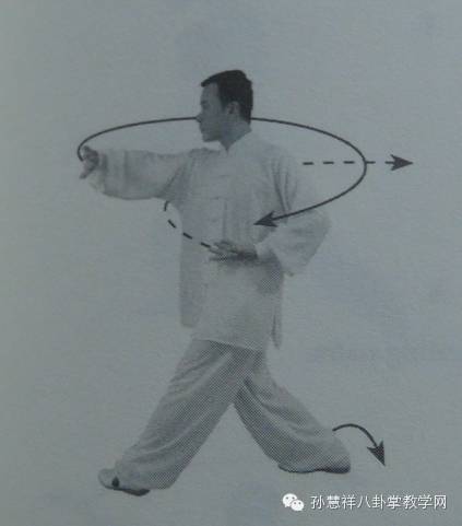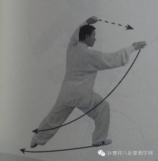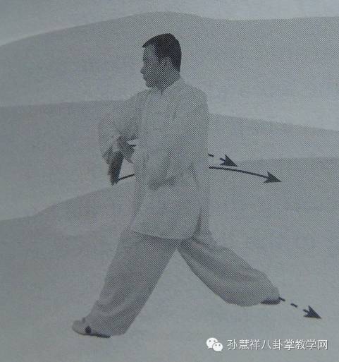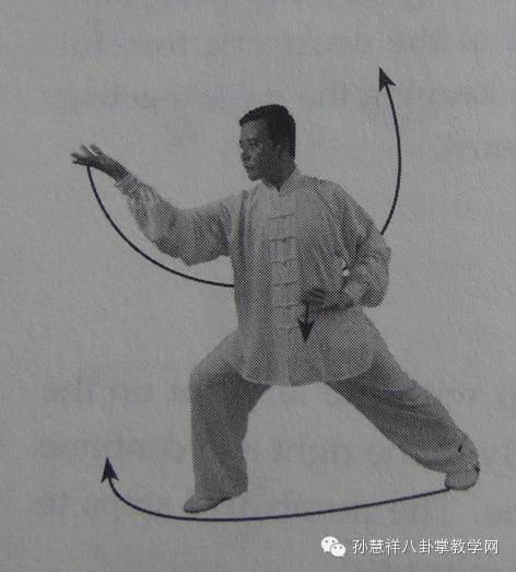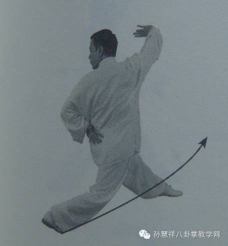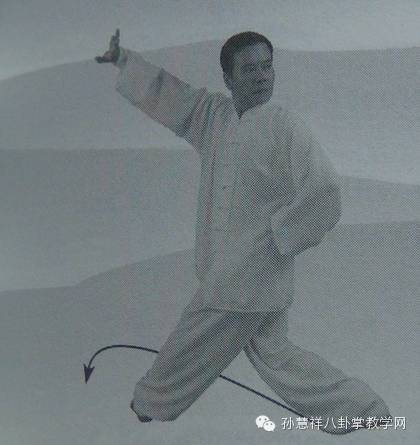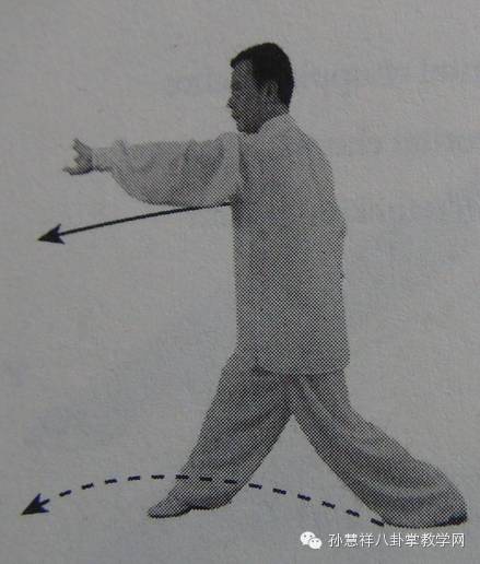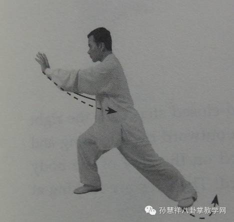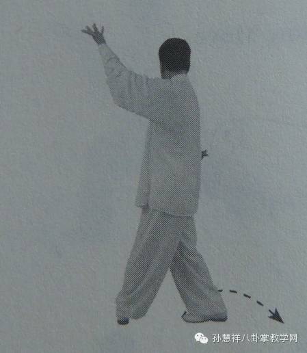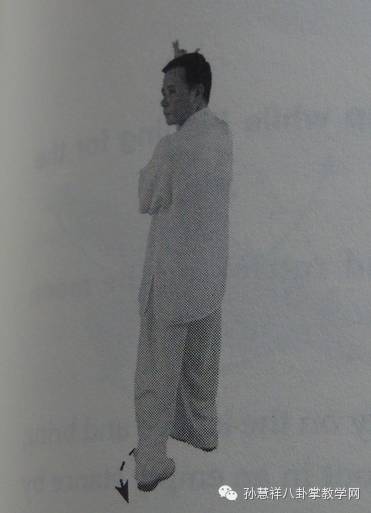 左脚(圈外脚)进步,平扣步,左脚横于右脚前.右脚尖对准左横脚的中心方向.两脚成90度(丁字型)。上身姿势不变(图6.2.1)。