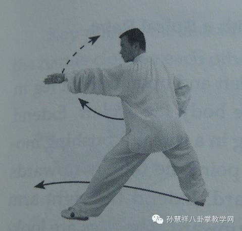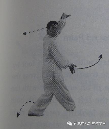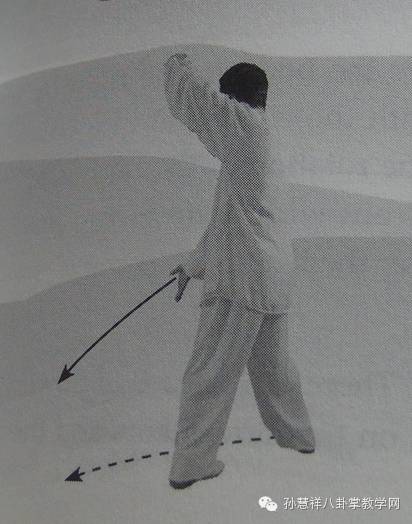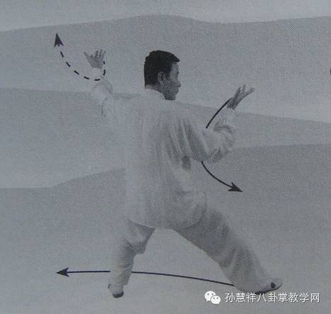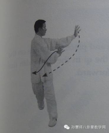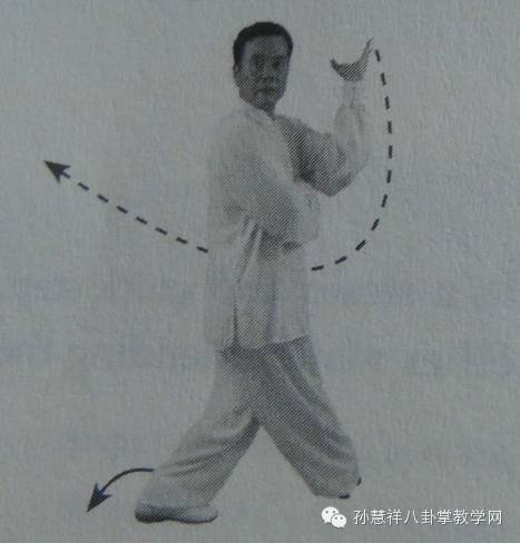 右脚向斜后方撤步,右手紧随右脚运动,向右转体.同时向右后方画弧斜捞,掌心向外,臂要伸直而稍有弯曲,左脚调顺.左前臂内旋.掌心向上.手随转体而动,目视右手方向(图6.22.2)。