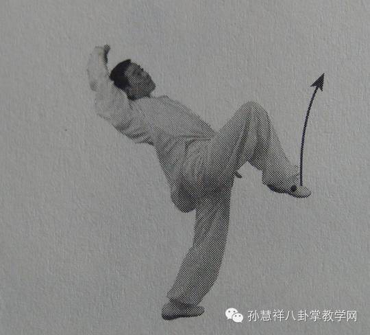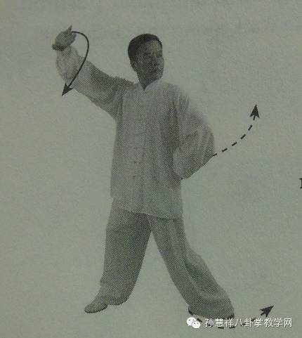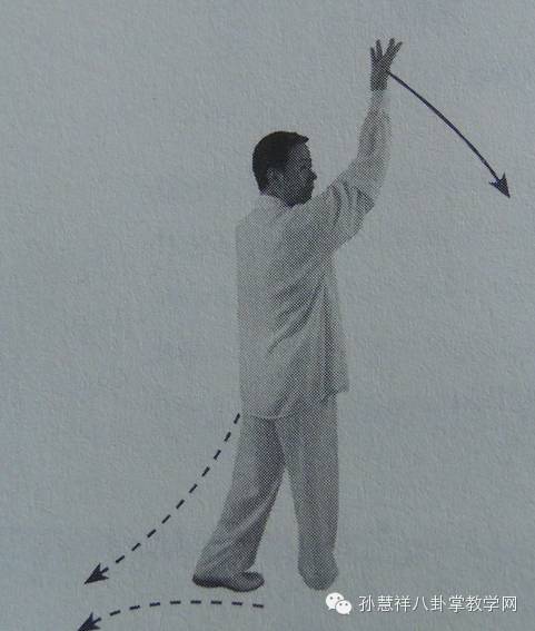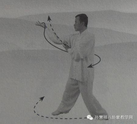 重心前移,左脚尖外摆.右脚进步。右前臂外旋.右手下垂自下而上画弧上挑掌。虎口朝上。右腿弓膝.左腿挺直。目视右手方向(图6.22.5)。