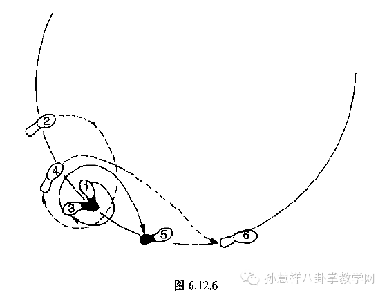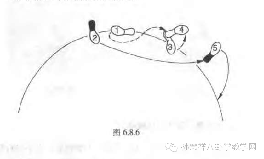 向右转体.右脚尖外摆。左脚进步扣步.扣于右脚之前,同时左手贴肋.随转体旋至右腋下.手指位于肩外.掌心向上.手指上翘。右臂撑圆,掌心向外.顶项垂肩,同时向右旋腰.左手指指向圆心.目视左手方向(图6.24.5)。