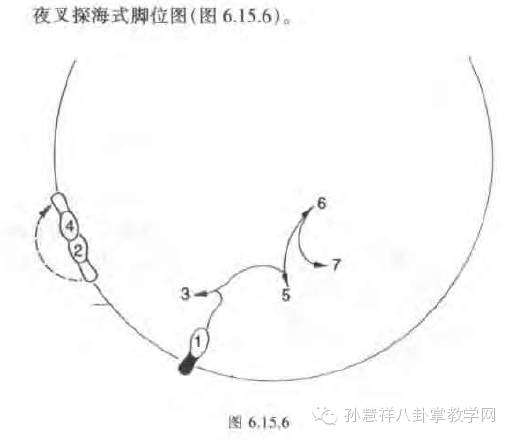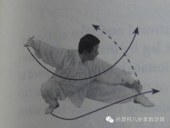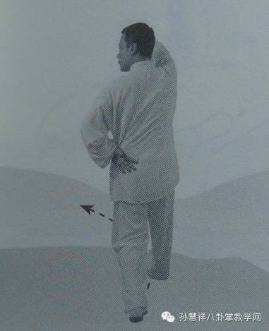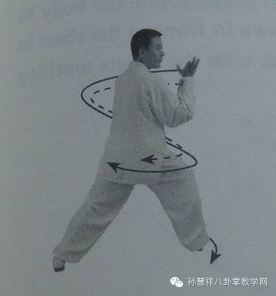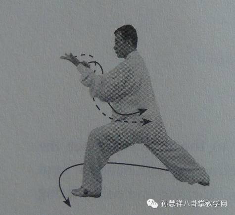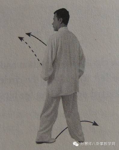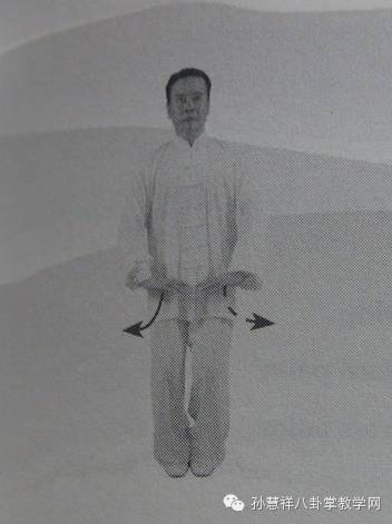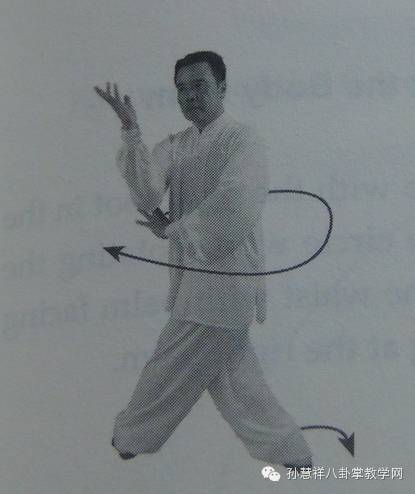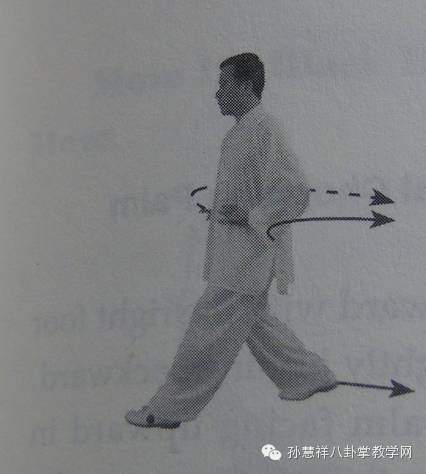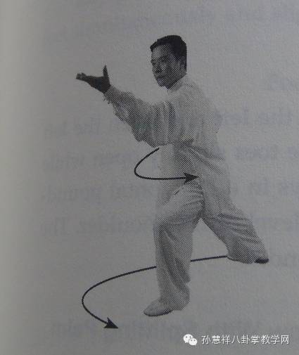 首先腰部顺时针画圈放松腰肌,左脚向前迈进半步.右脚随圈线行走.紧档吸胯.两眼平视(图6.1.3、图6.1.4)。