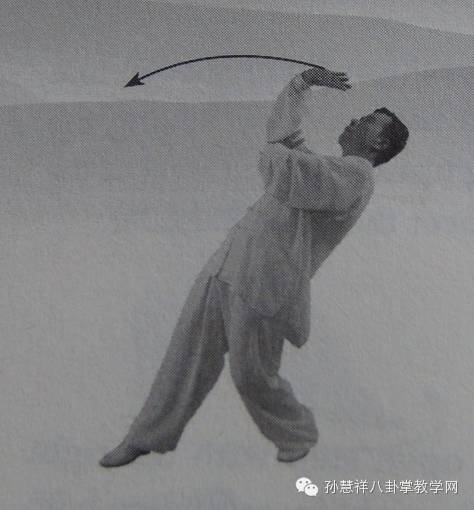 翻手搨掌;左脚回摆步,两手型不变.继续向左转体.两前臂同时内旋.两掌挑动.翻手搨掌。两掌心向外,两臂成弓形。右手指指向左肘.右肘紧贴前胸。右脚调顺。继续向左扭摇,左臂外开.做到最大旋度.眼神随左手而旋(图6.24.8)。