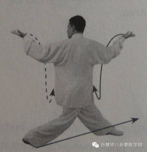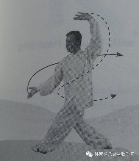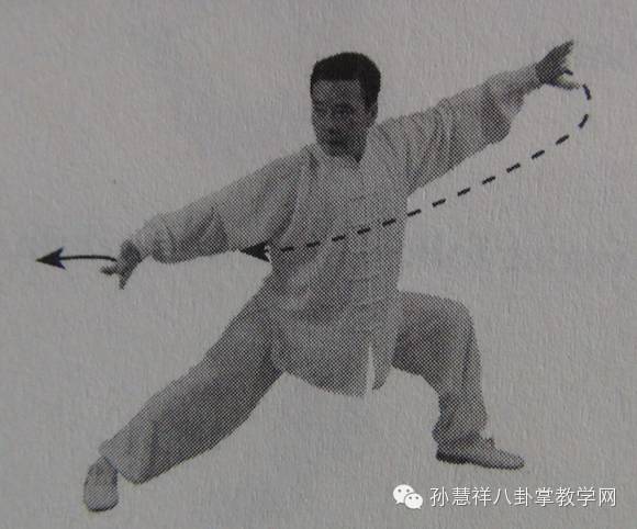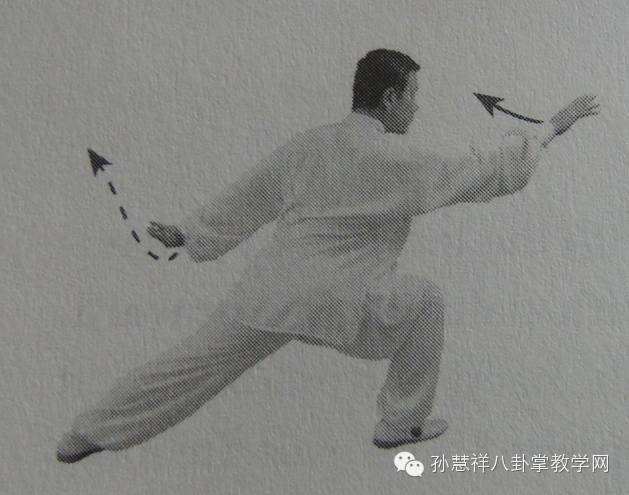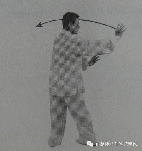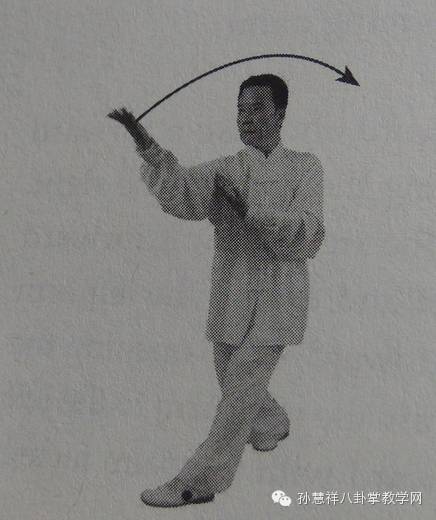 右脚回摆步,向右转体,两拳在转体的过程中.两拳相错,逐渐变掌。右臂长伸稍有弯曲.左手逐渐回收,收于右腋下.掌心向上(图6.1.8)。