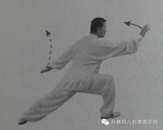 左手勾手并向后画弧.前臂外旋,拢至侧腰,掌心向上.眼神随左手而周转(图6.24.4)。