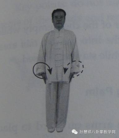 两前臂外旋,两手经腹前同时伸出。掌心向上,高与肩齐,四指自然并拢。虎口撑圆,两肘向下,沉肩坠肘。两肩与胸成弓形。两目平视,行桩步数不限(图6.1.5)。