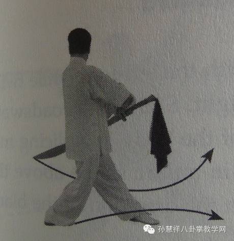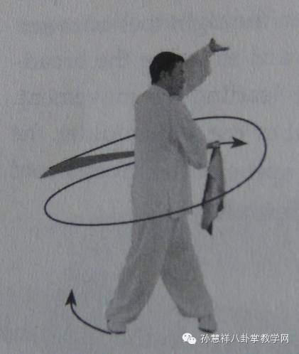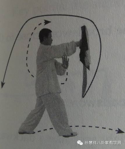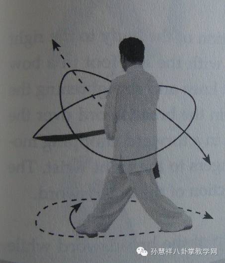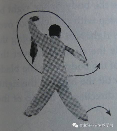 上体姿势不变.上动不停。随圆形线走八卦行桩步.步数不限(图8.8、图8.9 )。