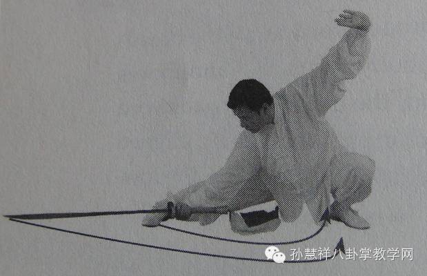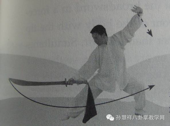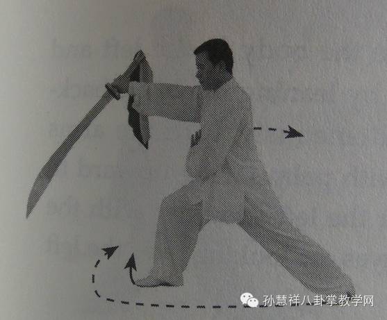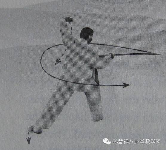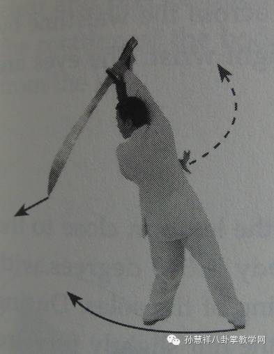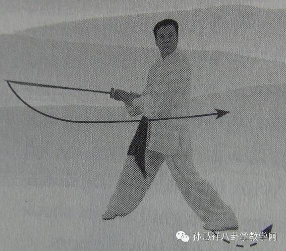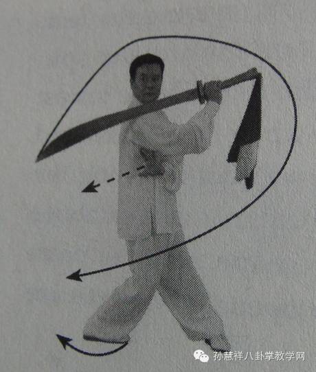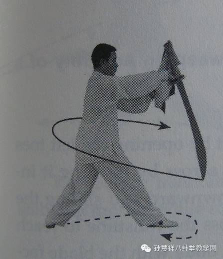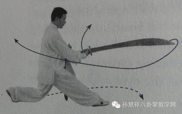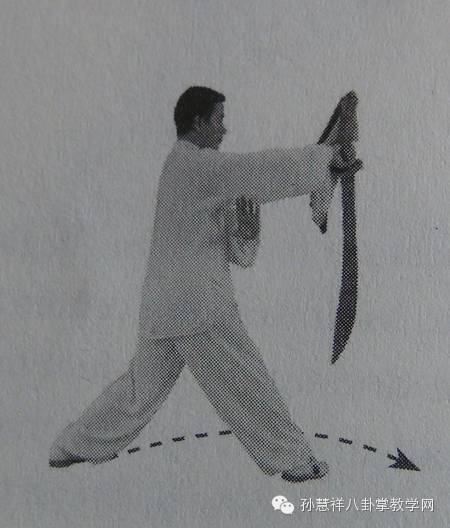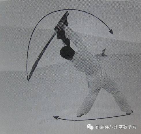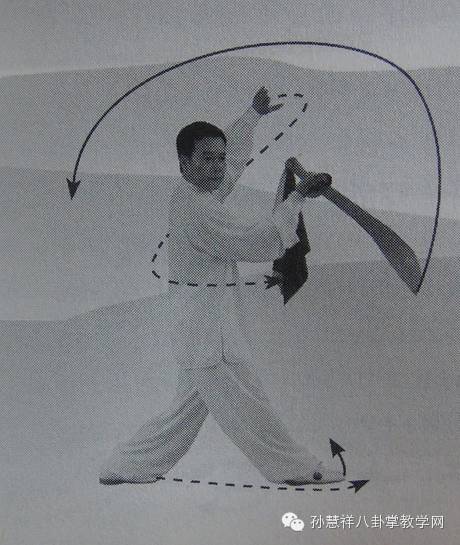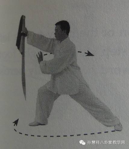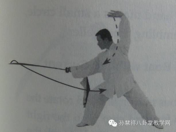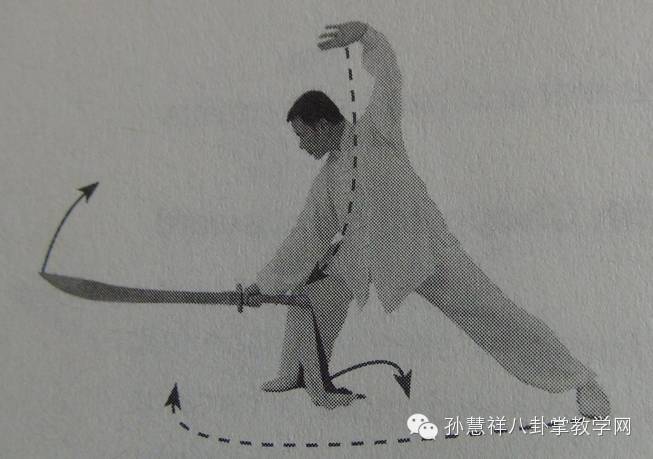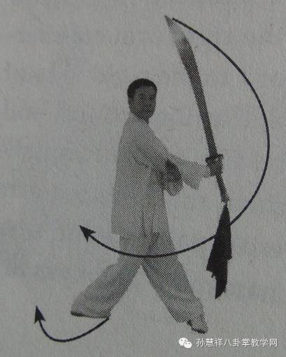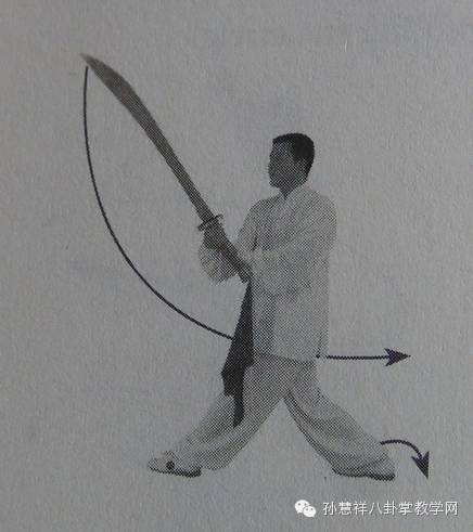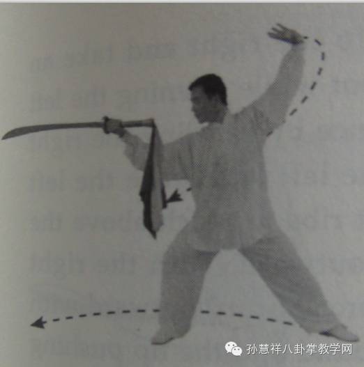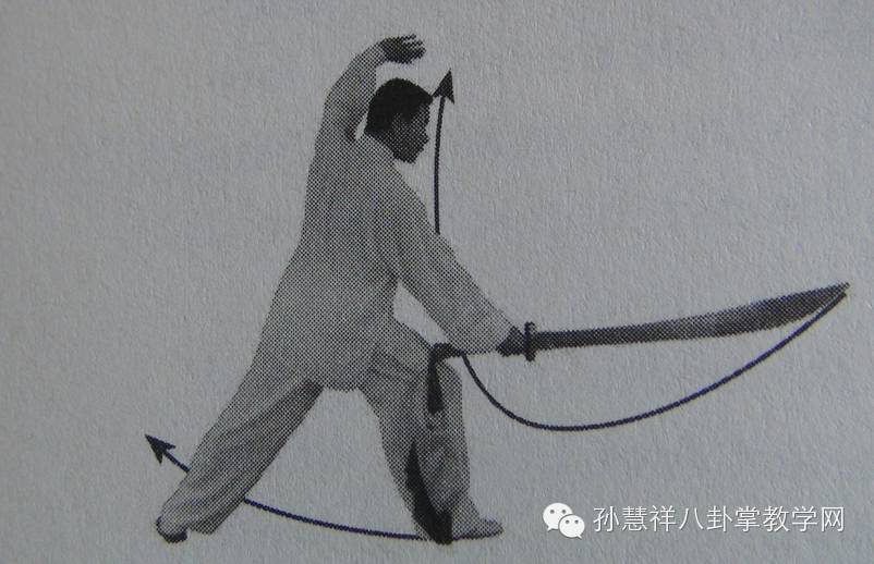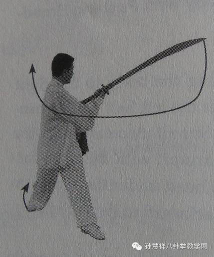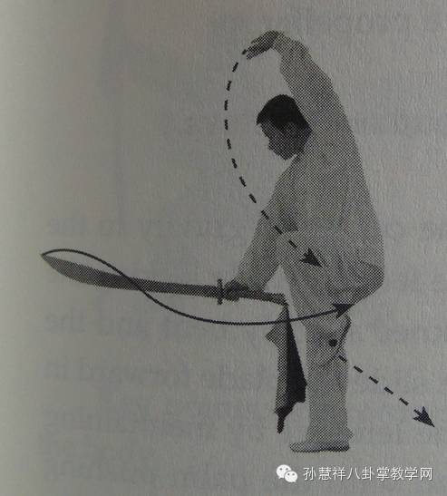 (1)向右转体。右脚摆步,刀刃领先,从脚前画弧撩刀。提起右手将刀斜提.刀刃向左前方。左手位于右腋下向外搨掌。臂成弓形。视线通过刀肚方向.向圈心方向平视。