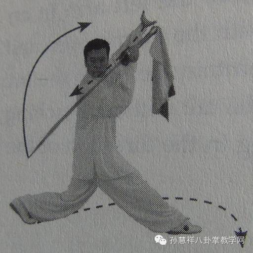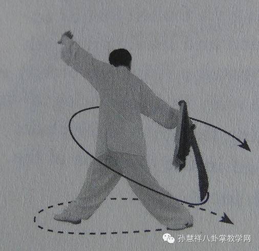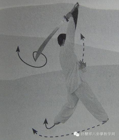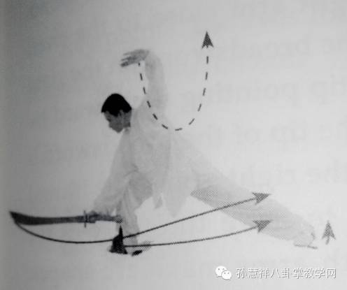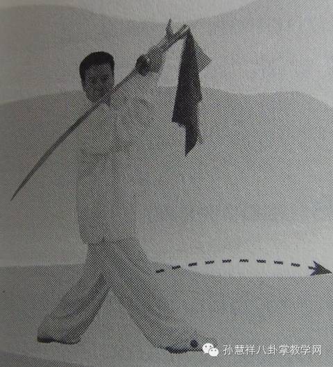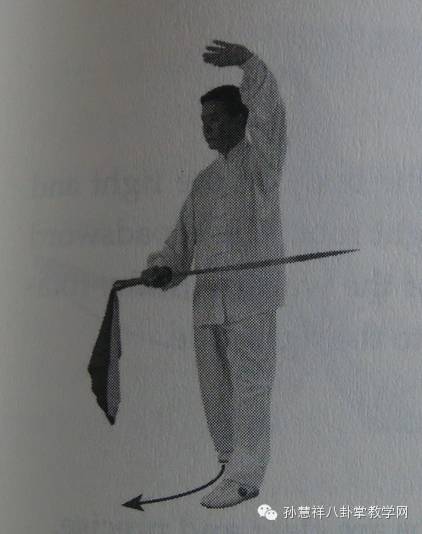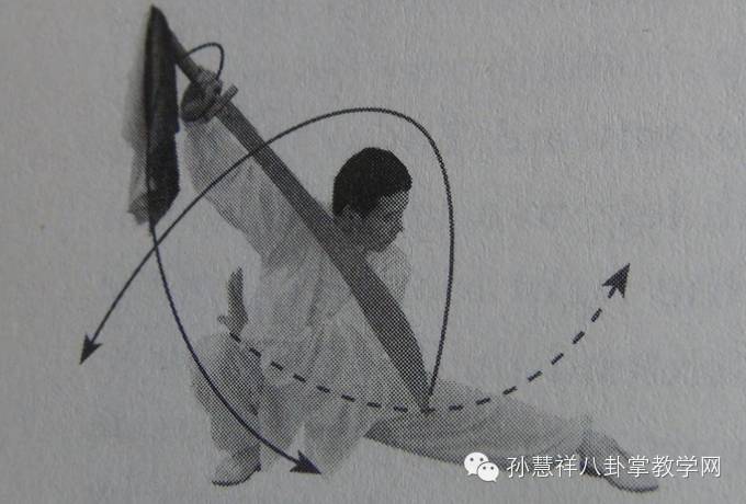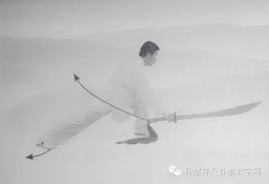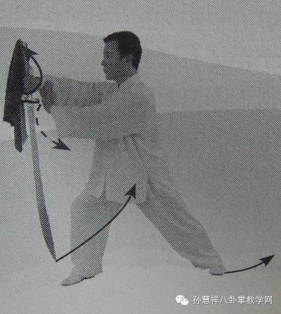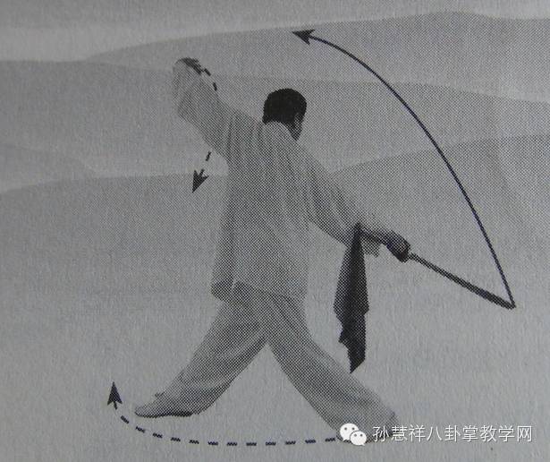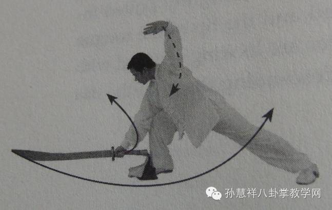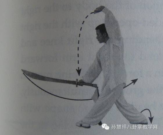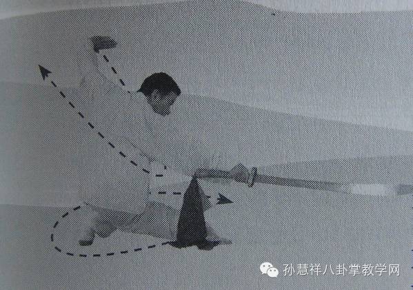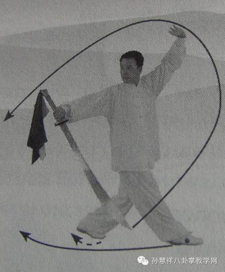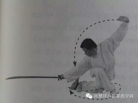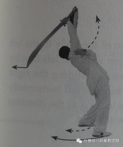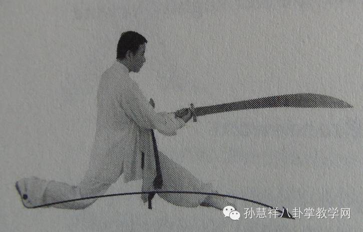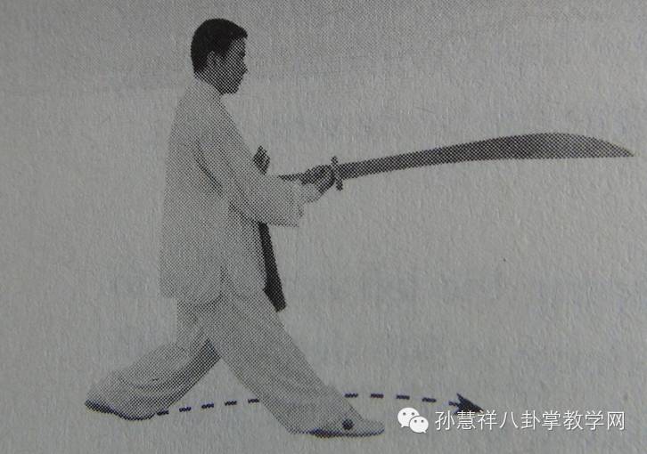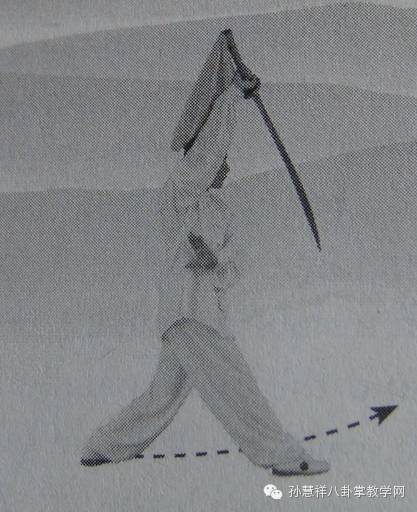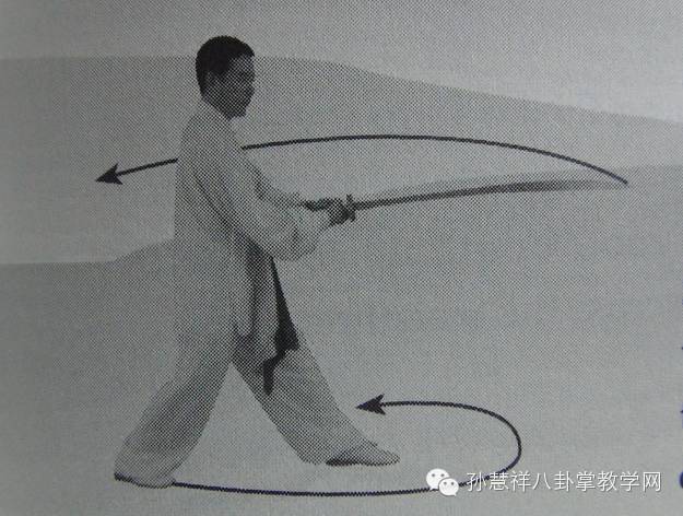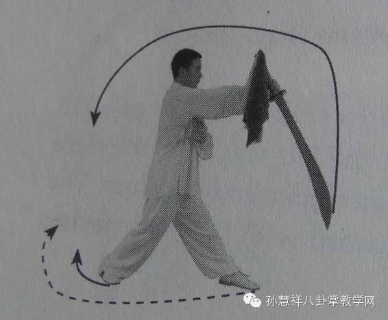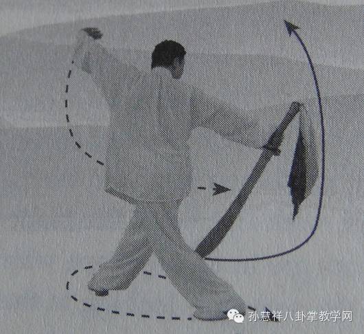 (1)向右转体。右脚摆步,刀刃领先,从脚前画弧撩刀。提起右手将刀斜提.刀刃向左前方。左手位于右腋下向外搨掌。臂成弓形。视线通过刀肚方向.向圈心方向平视。