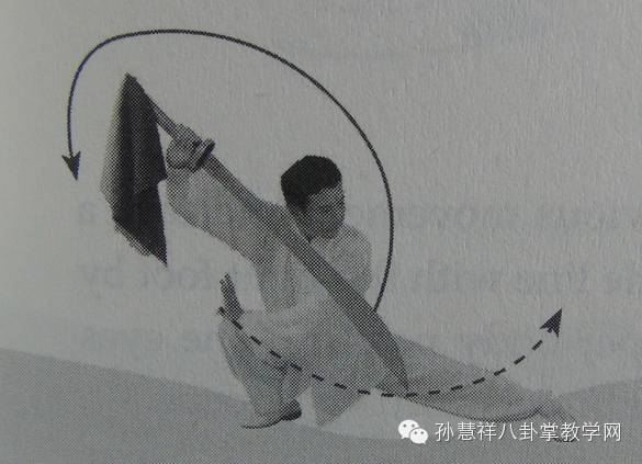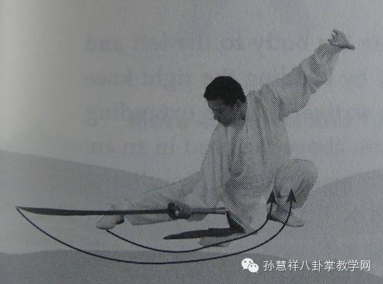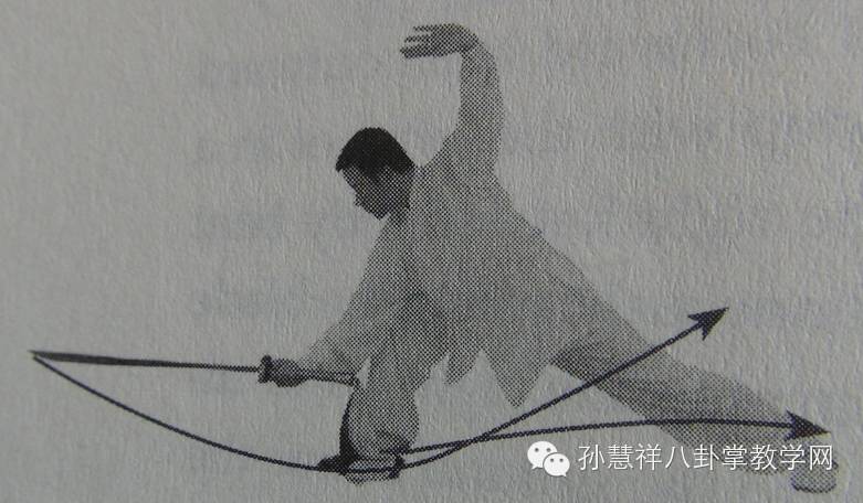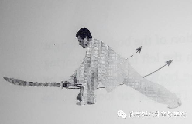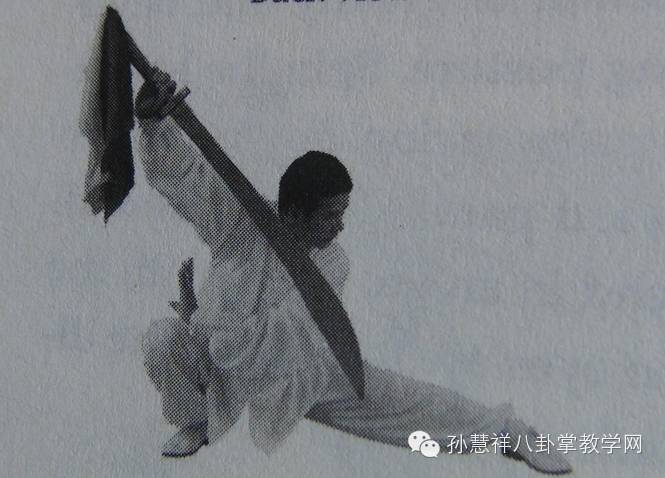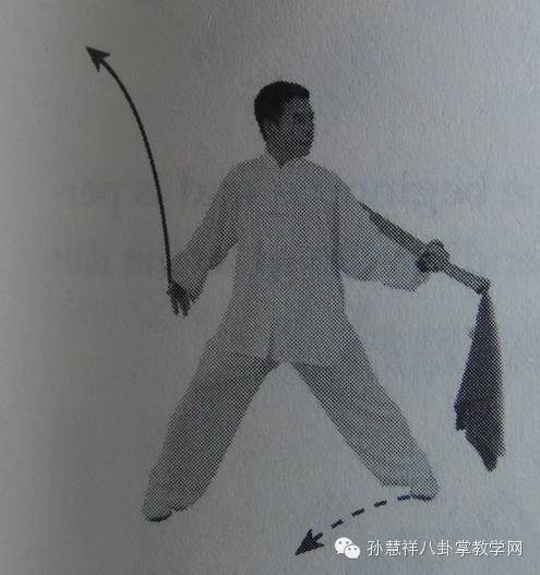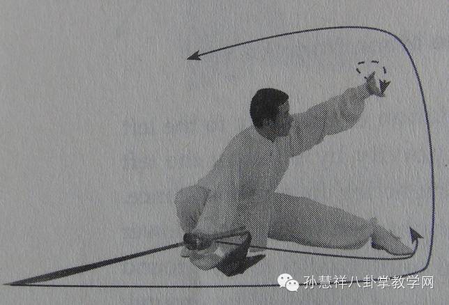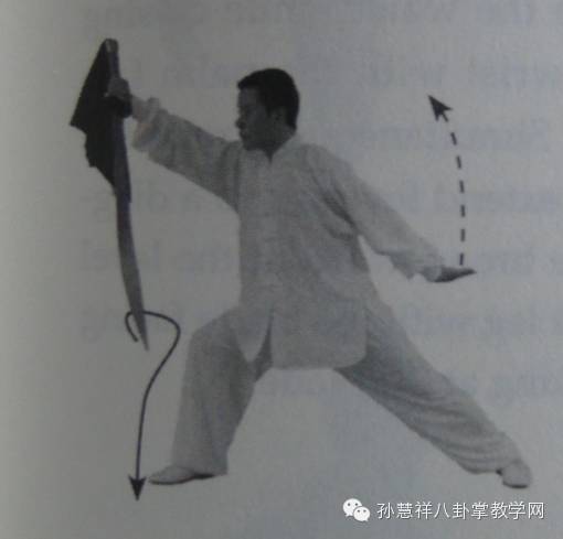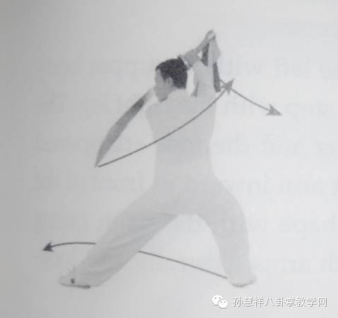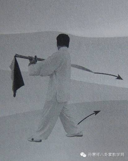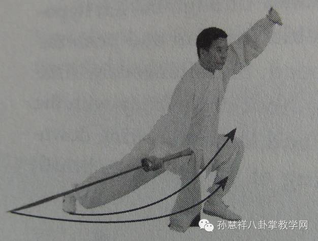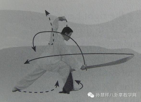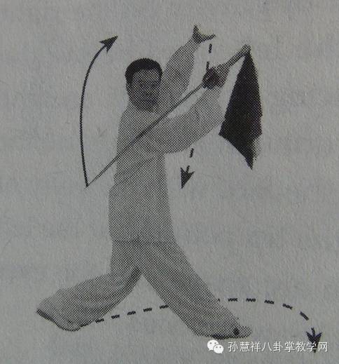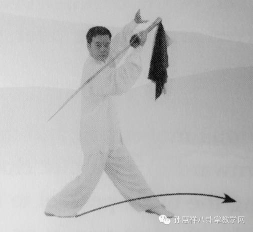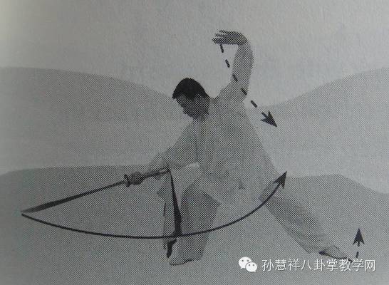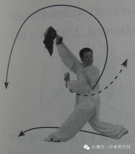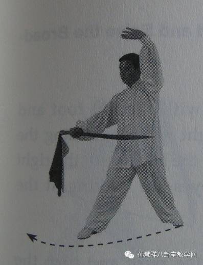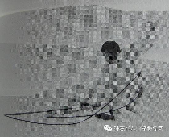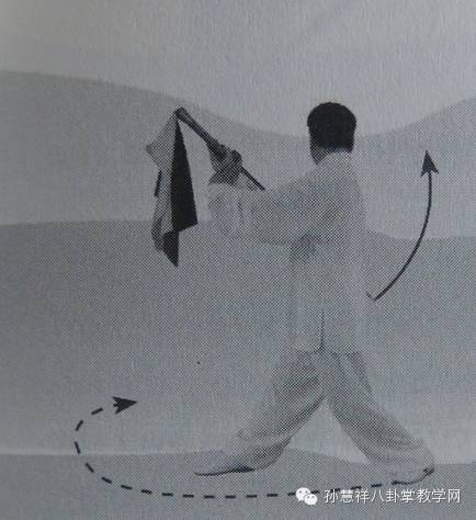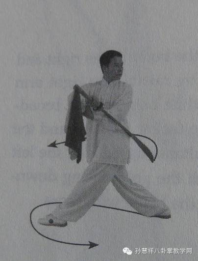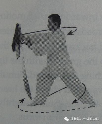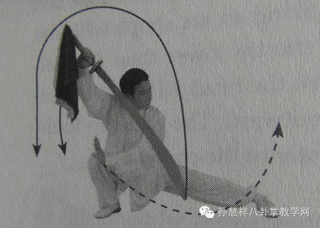 (1)向右转体。右脚摆步,刀刃领先,从脚前画弧撩刀。提起右手将刀斜提.刀刃向左前方。左手位于右腋下向外搨掌。臂成弓形。视线通过刀肚方向.向圈心方向平视。