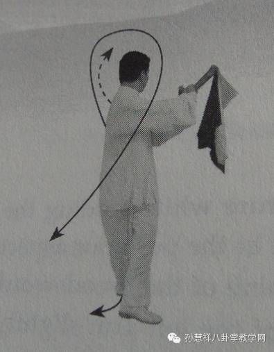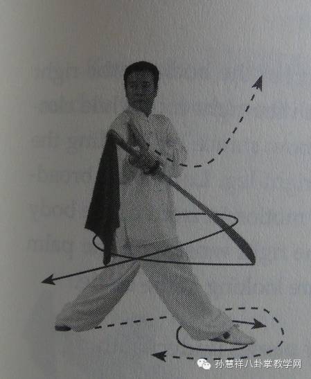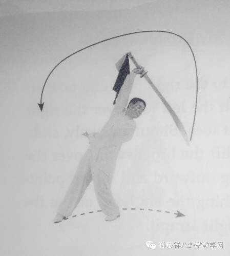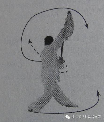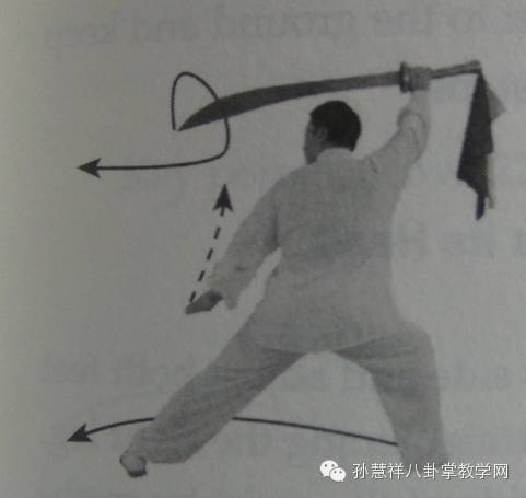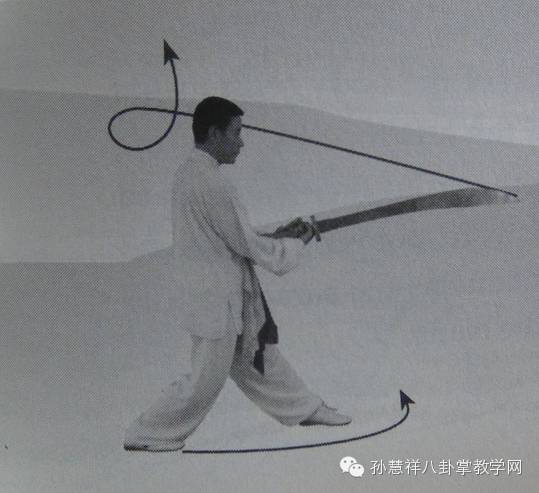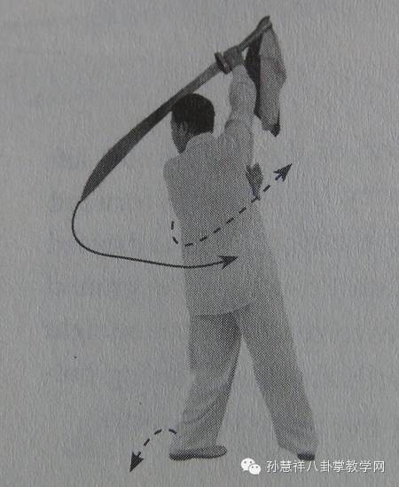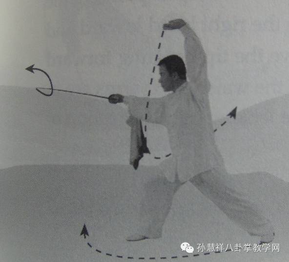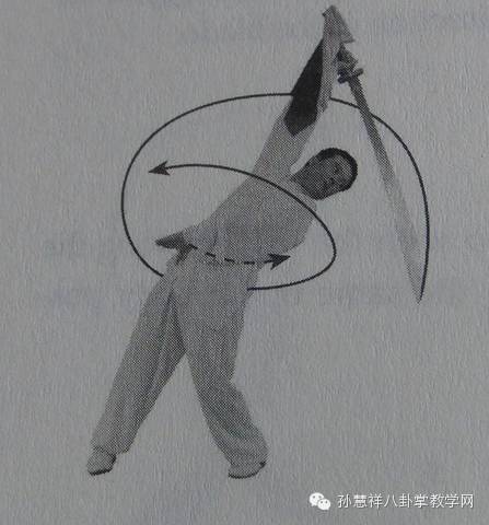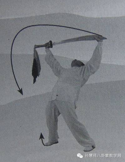 要点:身动与刀动要协调一致。右手在头顶之上,刀身竖直,刀尖朝下.使刀围绕身体缠绕一周半。