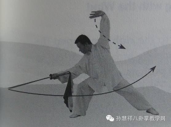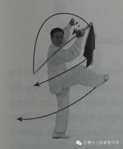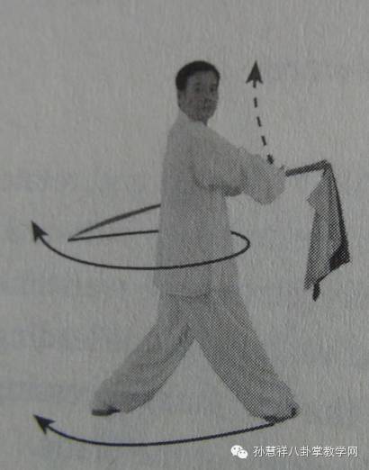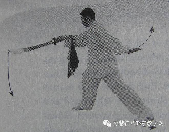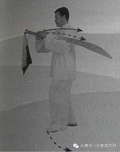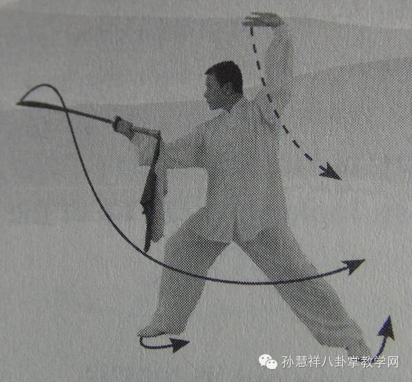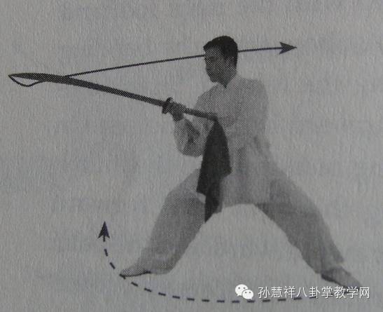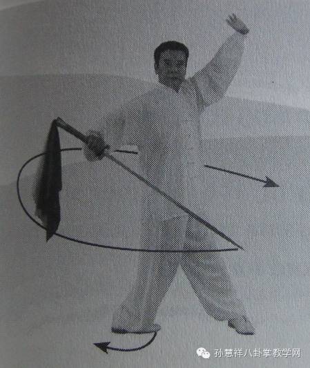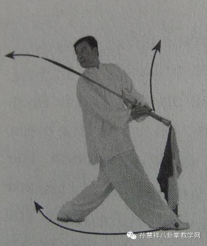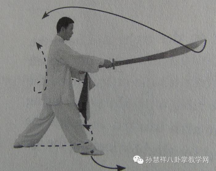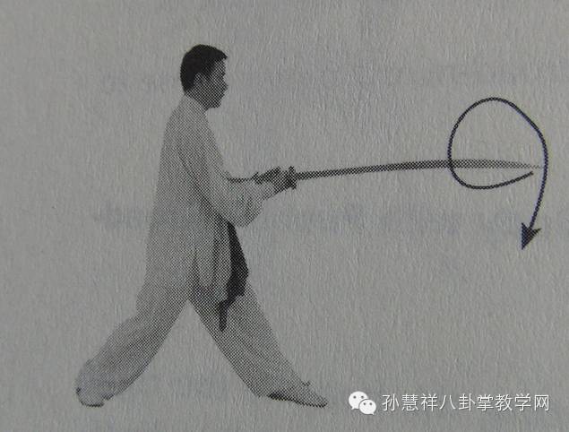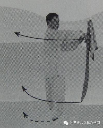 要点:动作要连贯.一气呵成。在运动中刀尾与刀尖同时画弧.右手画小弧.刀尖画大弧。动作与划船时摇橹相似。