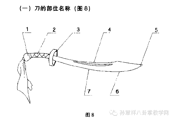 1——刀尾;2——刀柄;3——刀护手;4——刀背;5----刀尖;6——刀肚:7——刀刃。