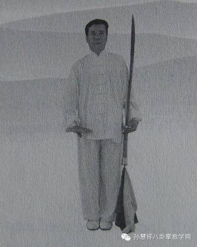 身体处于立正姿势,左手握住刀护手外侧,刀尖朝上,刀身直立,刀背紧贴左臂前侧,刀刃朝前,并稍向外倾斜。两臂自然下垂.右手紧贴右腿的外侧,五指自然伸展。两腿自然靠紧.两脚跟紧靠,两脚尖外展成60度角。两肩自然下沉。顶项收颌,嘴要自然合闭,舌顶上腭,腰略后抽。臀要向前收敛。两目正视前方,精神贯注(图8.1)。
