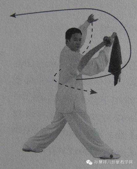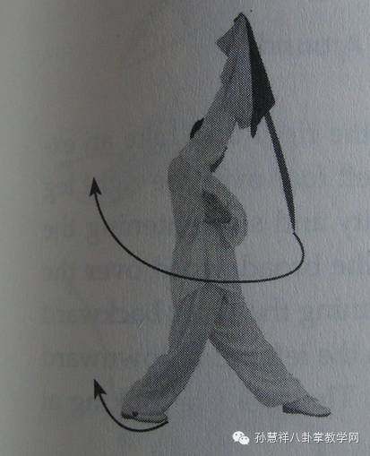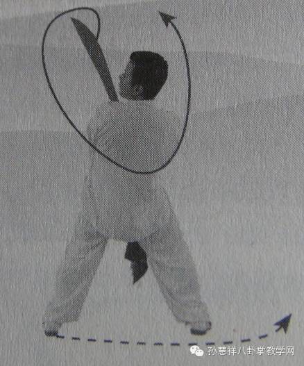 (3)左脚向后摆步。右脚扣步,向左转体一周.左脚调顺。右手撩起,向上前方揭掌。目视圈心(图8.119)。