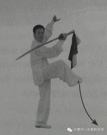 上动不停。重心移至左腿。左腿自然直立。同时右腿踢起.膝要稍屈,脚面绷直.脚尖里合。刀刃领先。向左上方画弧。左手虎口撑圆.掌心内空而向外搨掌。刀身向后倾料.刀刃向外斜托,刀尖低于刀尾。目视刀肚方向,直视圆心(图8.18)。