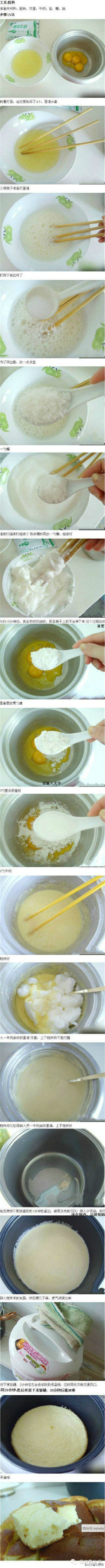 现在就让我们开始学习,怎么用电饭锅做出香喷喷的蛋糕吧!材料只需:面粉,鸡蛋,牛奶,盐,糖,油!