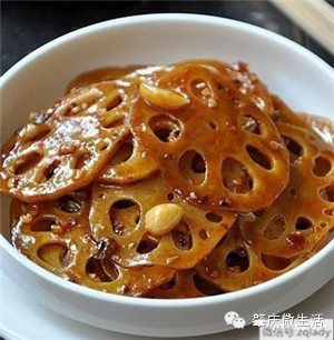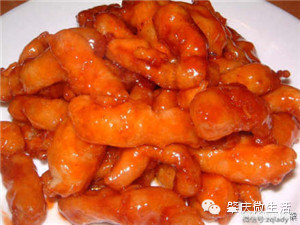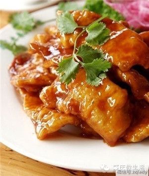 (4)锅留底油,烹入糖醋汁,倒入肉片,翻勺,淋香油出勺即