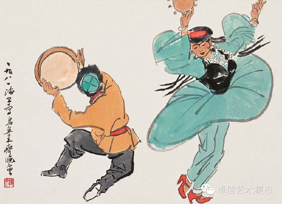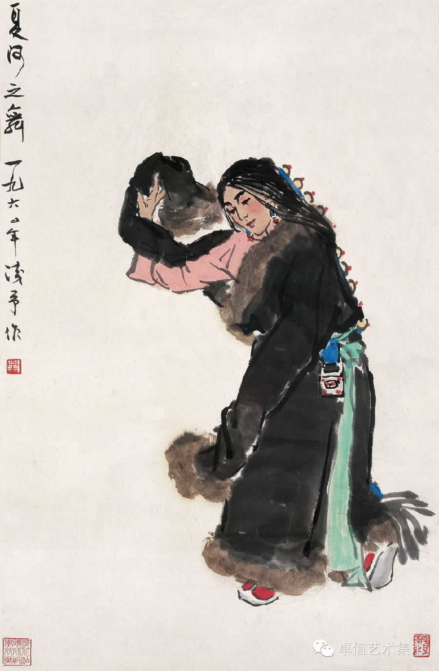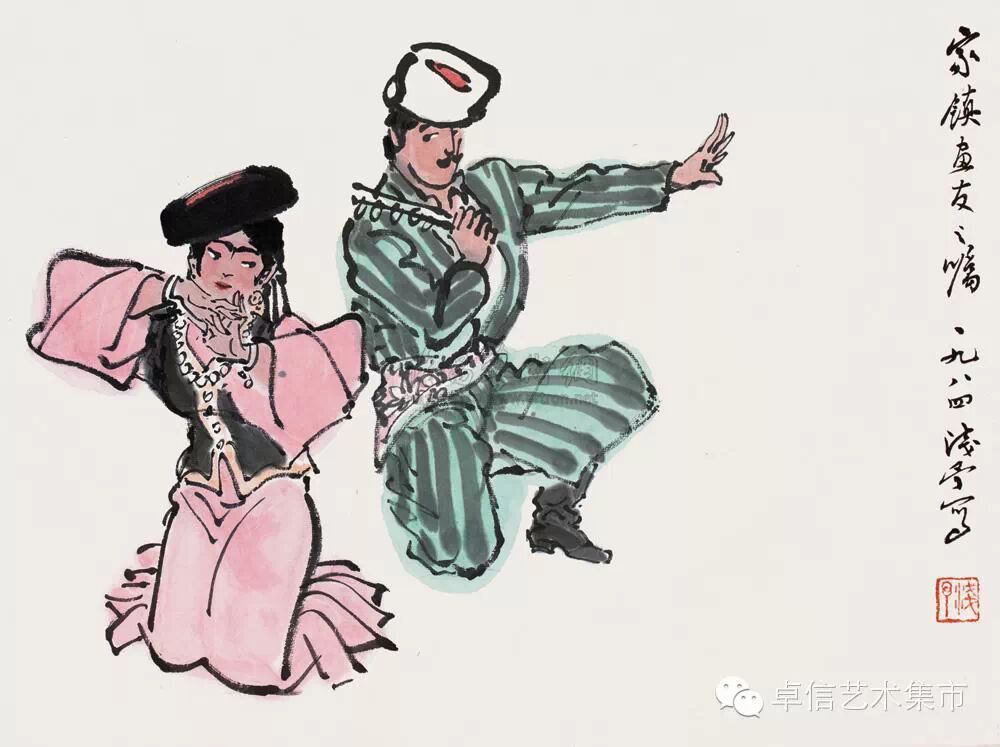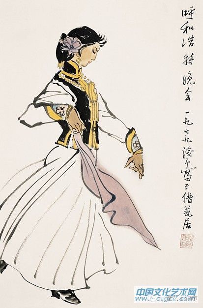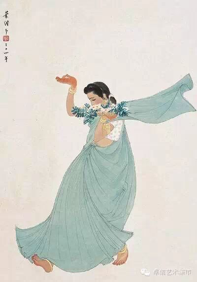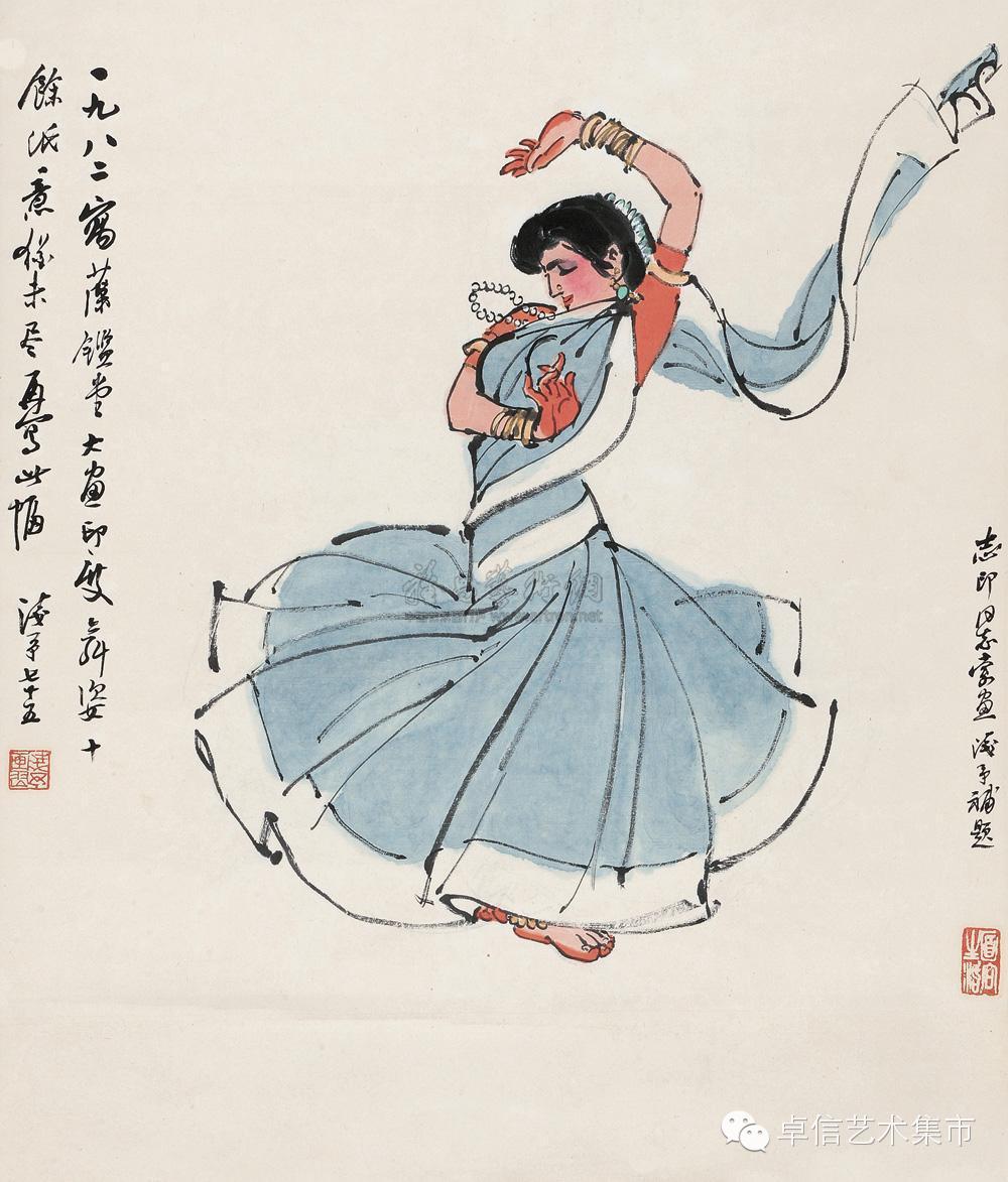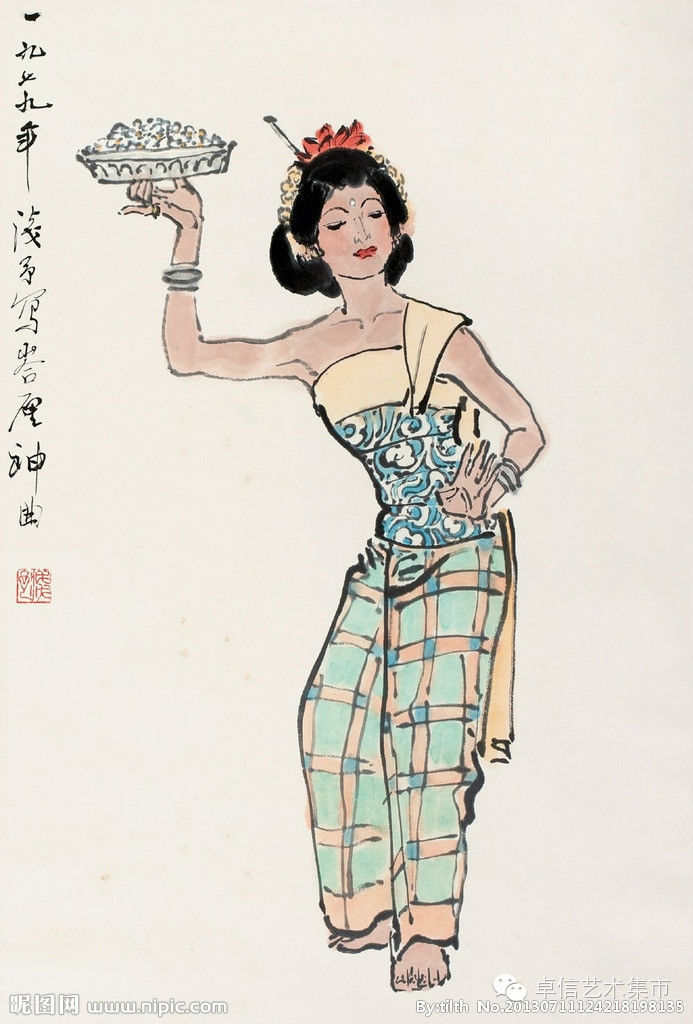 第三类是舞蹈人物画。40年代,叶浅予离开漫画,走向国画。第一批作品便是他访问印度归来所作的印度舞画。他用敦煌壁画和佛画的手法画天竺舞,用色厚重,线条工整流畅,有点壁画风。对这批画,徐悲鸿的评语是:“浅予之国画,如其速写人物,笔法轻快,动中肯綮。”宗白华的评语是:“浅予的印度舞面,是古典美与现代美的结合。”到了60年代,他的笔墨解放,出现了画舞的高潮。代表作如婆罗多舞和献花舞,和阗装和夏河装,画上人物洒脱、妩媚、奔放,画界咸谓浅予舞画,60年代是高峰。可惜一阵政治狂飚,打落了他的画笔,掐断了他的艺术黄金时期。70年代后期,他重握画笔,把全部感情倾注到家乡的山水人物。他以两年之期,三易其稿,画成《富春山居新图》长卷,以后又再画《富春人物画谱》百本,老笔纷披,重见他30年代画漫画时的姿肆笔墨。这时期,他不以画舞为满足,尝试国画与漫画的融合,《长安怀古》四题便是。半坡纹、马嵬坡两题,都是有点漫画味。黄苗子说有点马蒂斯味,这当然是画家寻求绘画形式色彩中的一种巧合。