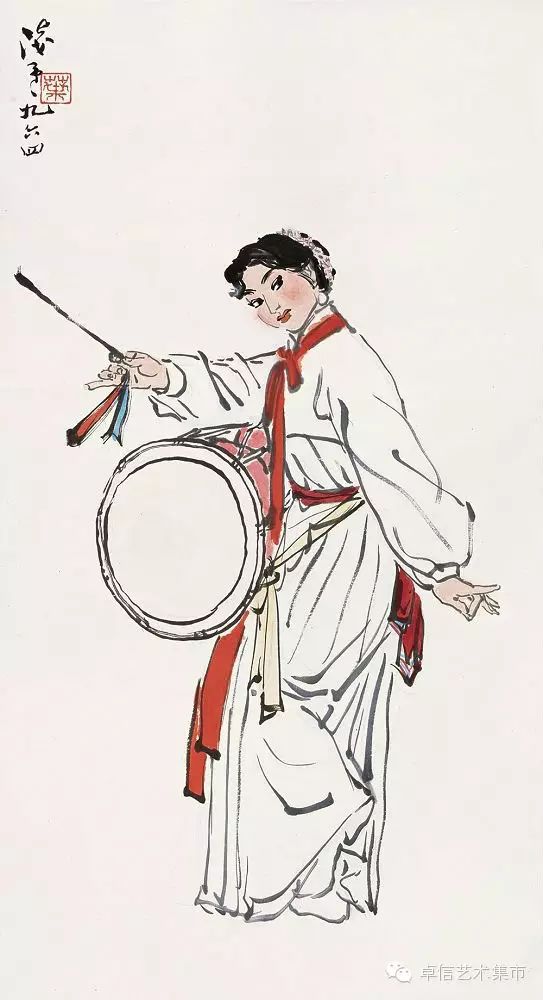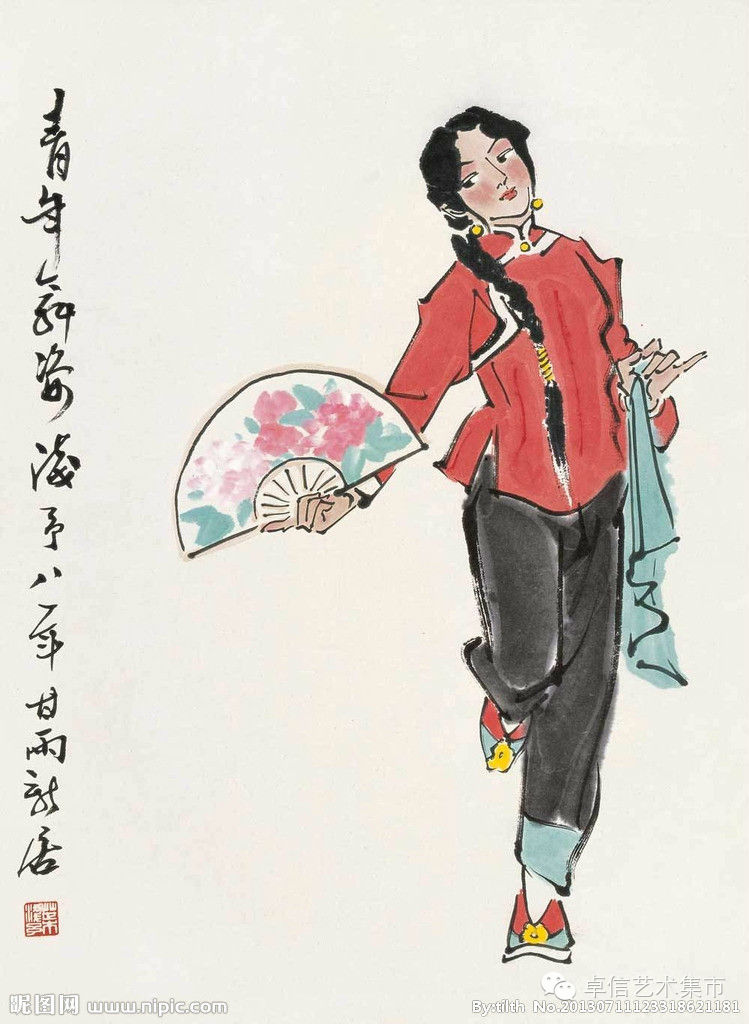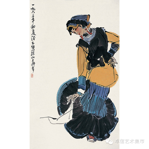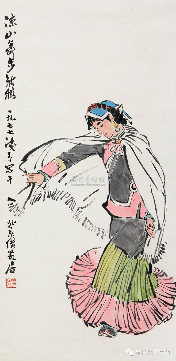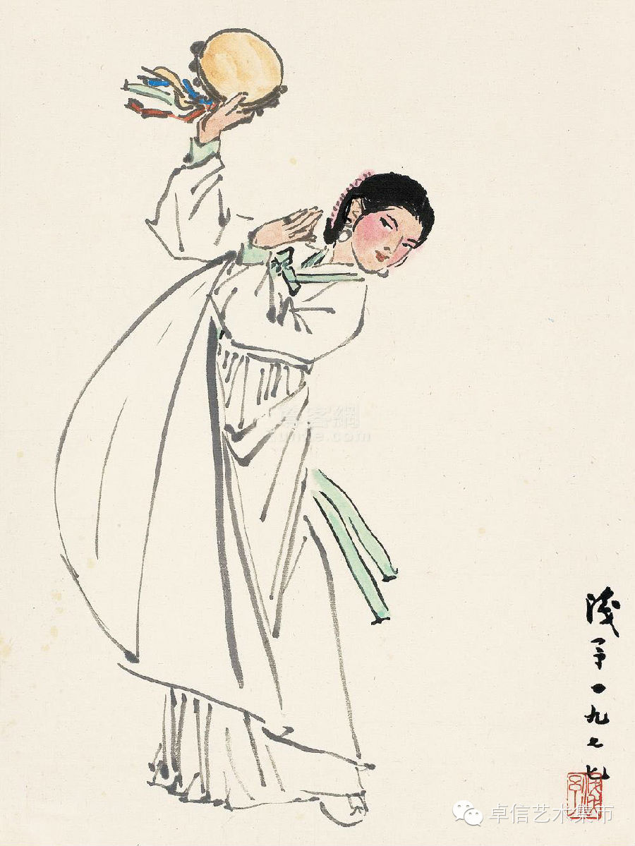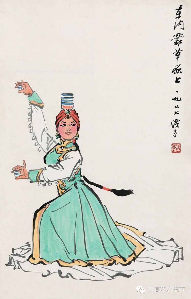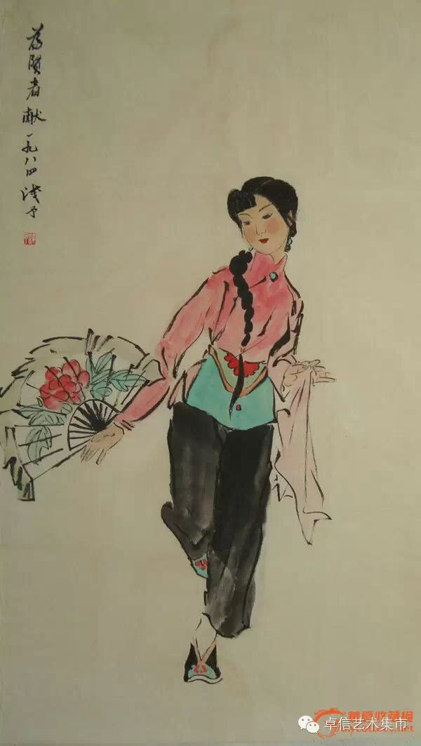 第三类是舞蹈人物画。40年代,叶浅予离开漫画,走向国画。第一批作品便是他访问印度归来所作的印度舞画。他用敦煌壁画和佛画的手法画天竺舞,用色厚重,线条工整流畅,有点壁画风。对这批画,徐悲鸿的评语是:“浅予之国画,如其速写人物,笔法轻快,动中肯綮。”宗白华的评语是:“浅予的印度舞面,是古典美与现代美的结合。”到了60年代,他的笔墨解放,出现了画舞的高潮。代表作如婆罗多舞和献花舞,和阗装和夏河装,画上人物洒脱、妩媚、奔放,画界咸谓浅予舞画,60年代是高峰。可惜一阵政治狂飚,打落了他的画笔,掐断了他的艺术黄金时期。70年代后期,他重握画笔,把全部感情倾注到家乡的山水人物。他以两年之期,三易其稿,画成《富春山居新图》长卷,以后又再画《富春人物画谱》百本,老笔纷披,重见他30年代画漫画时的姿肆笔墨。这时期,他不以画舞为满足,尝试国画与漫画的融合,《长安怀古》四题便是。半坡纹、马嵬坡两题,都是有点漫画味。黄苗子说有点马蒂斯味,这当然是画家寻求绘画形式色彩中的一种巧合。