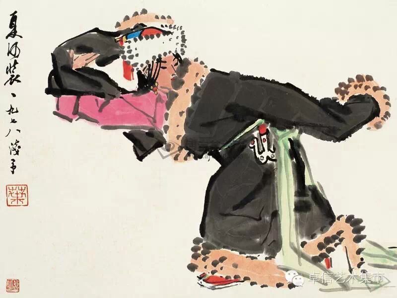 第二类是速写,叶浅予的速写,在画界无出其右。他从30年代起就速写本子不离身。那是从墨西哥漫画家珂佛罗皮斯处学来的。速写本成为画家的形象库。浅予速写,自然以舞台人物最有名。年轻一代人认识浅予艺术是从他五六十年代发表在报刊上的舞台速写开始的。他的速写,大部分是用铅笔线,从《天鹅湖》开始用水墨改画,线条减至无可再减,堪称减笔大师。