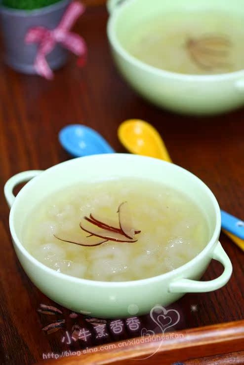 4:碗里放入摘清爽的雪蛤,注入适量的清水,放入红枣、冰糖,