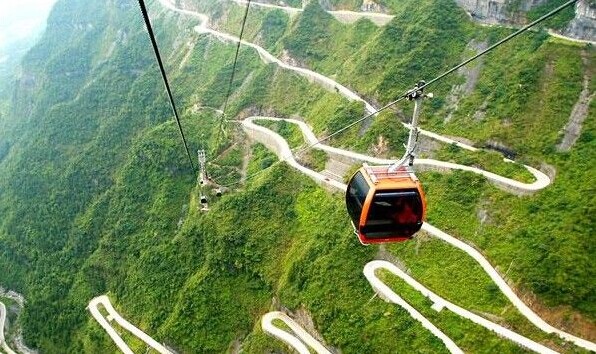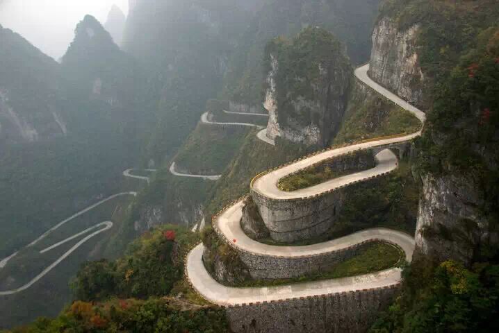张家界天门山盘山公路有"通天大道"之称,盘山公路全长10.77公里,海拔从200米急剧提升到1300米,大道两侧绝壁千仞,空谷幽深,共计99个弯,180度急弯此消彼长,似玉带环绕,弯弯紧连,层层迭起,被誉为“天下第一公路奇观”。