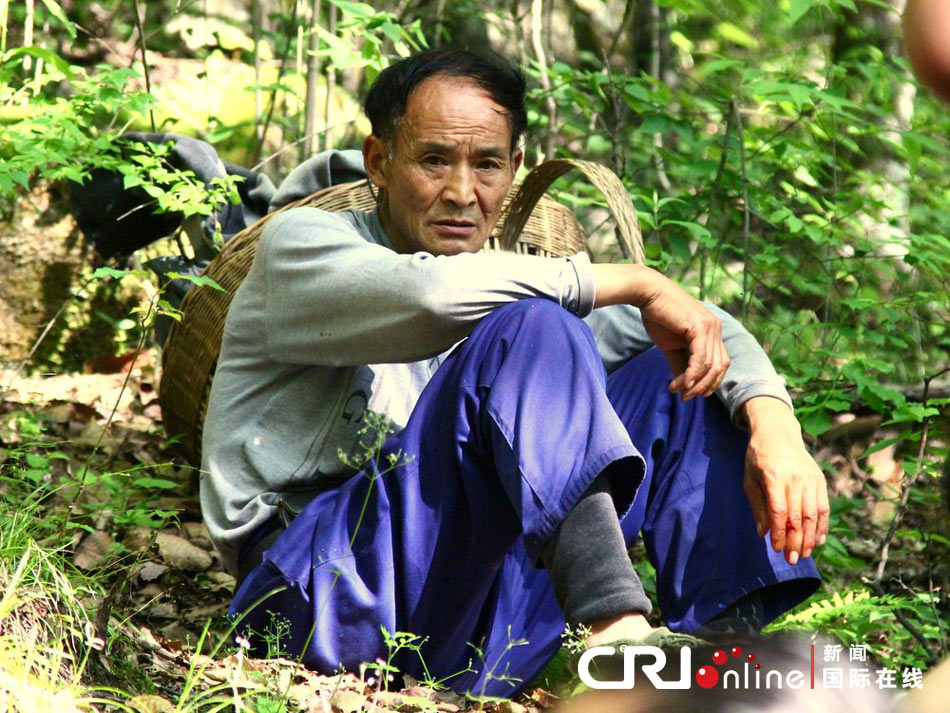 2013年5月28日,陕西安康市镇坪县,农民周正龙进入大巴山腹地,去寻找他期待见到的华南虎身影,随行的记者拍摄下他登山行走和在深山生活的画面。周正龙在山路上歇脚。图片来源:江苏李根/CFP