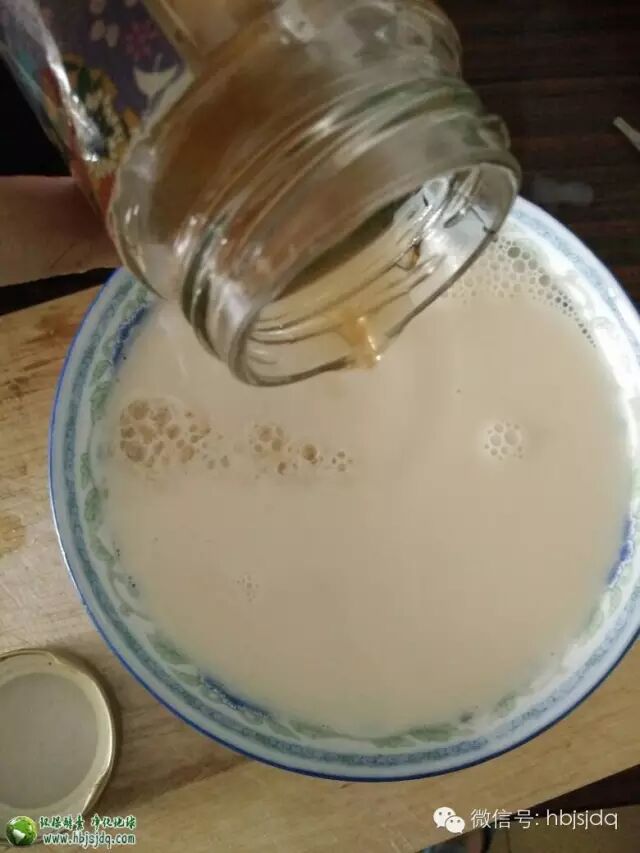待温度降低至不是很烫时,把大约20毫升的酵素原液慢慢倒进装有豆浆的碗里 。