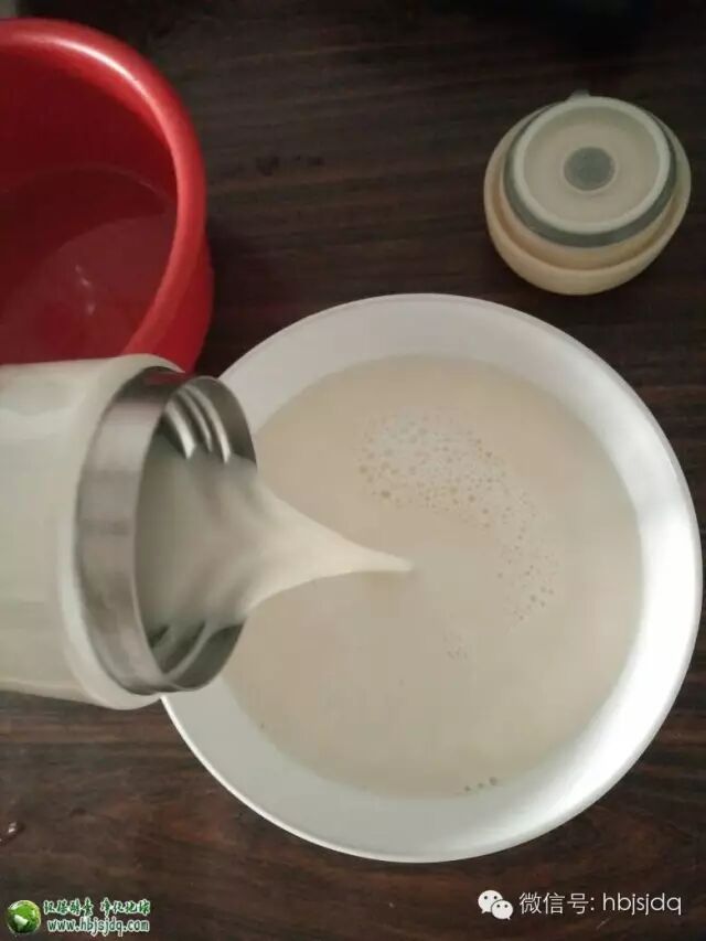 已经煮好的大约1000毫升的豆浆,从保温瓶倒进碗里。