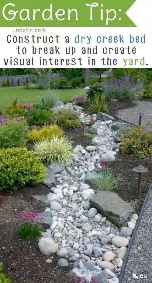 考虑做一条增加视觉趣味的旱溪吧!旱溪可以把庭院分割成不同的区域。它不仅看起来很美,也有利于在斜坡上排水,并且它是低维护的。