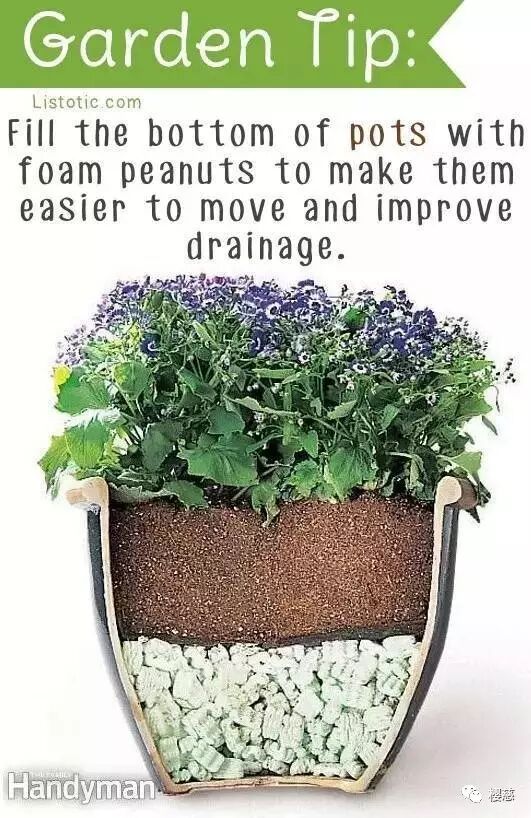在种植盆底部放入泡沫塑料有助于改善排水,泡沫塑料很轻,便于大型盆栽的移动。泡沫塑料又比土便宜。不过,要确保在泡沫塑料上铺上一层土工布哦,以便土不会漏到盆底。