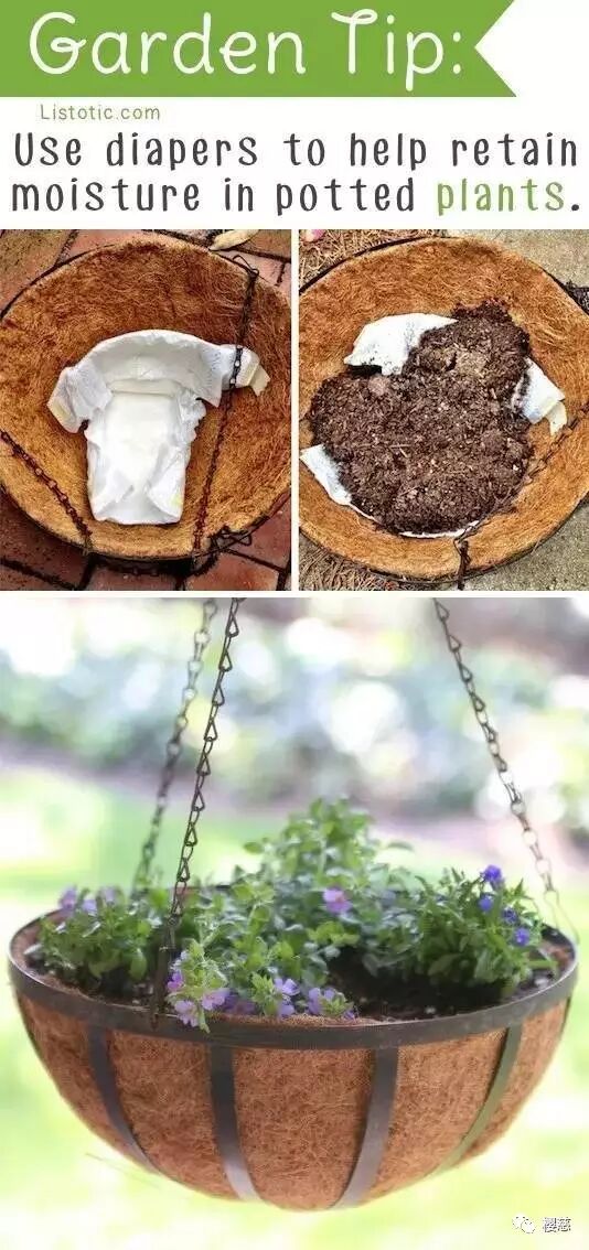 把尿布垫在盆栽植物里有利于土壤保湿,尤其是对那些在夏天需要每天浇水的植物。
