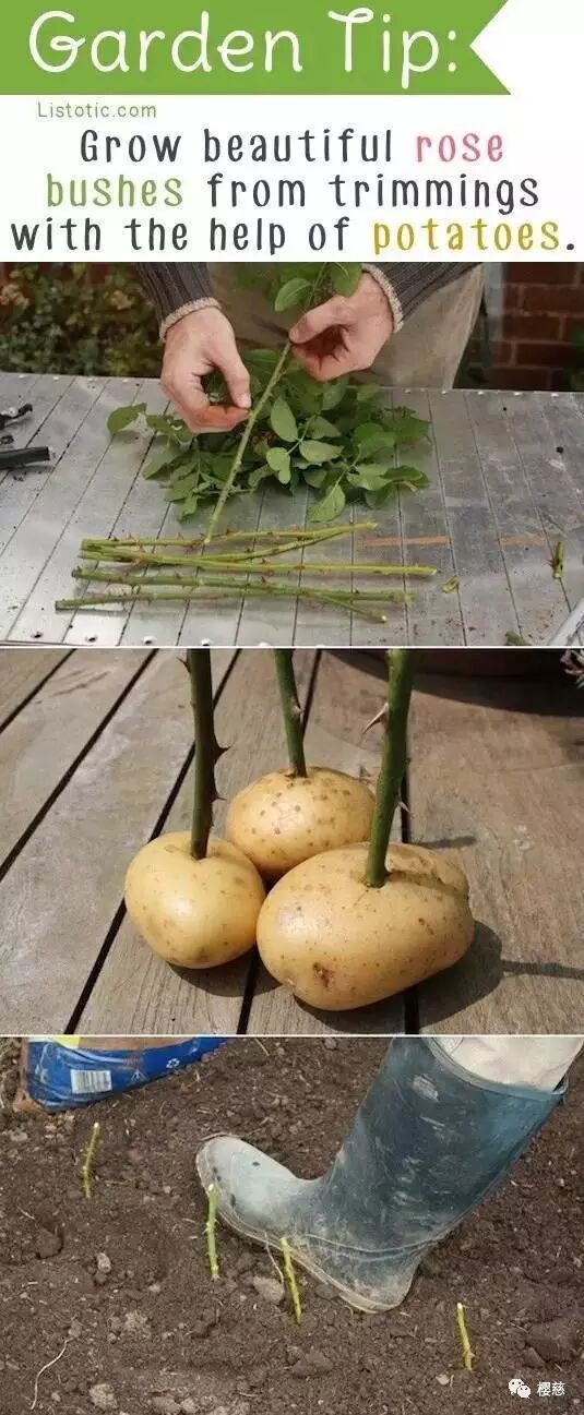 把玫瑰扦插条的底部插到一个小土豆里,有利于保水和促进枝条长根。