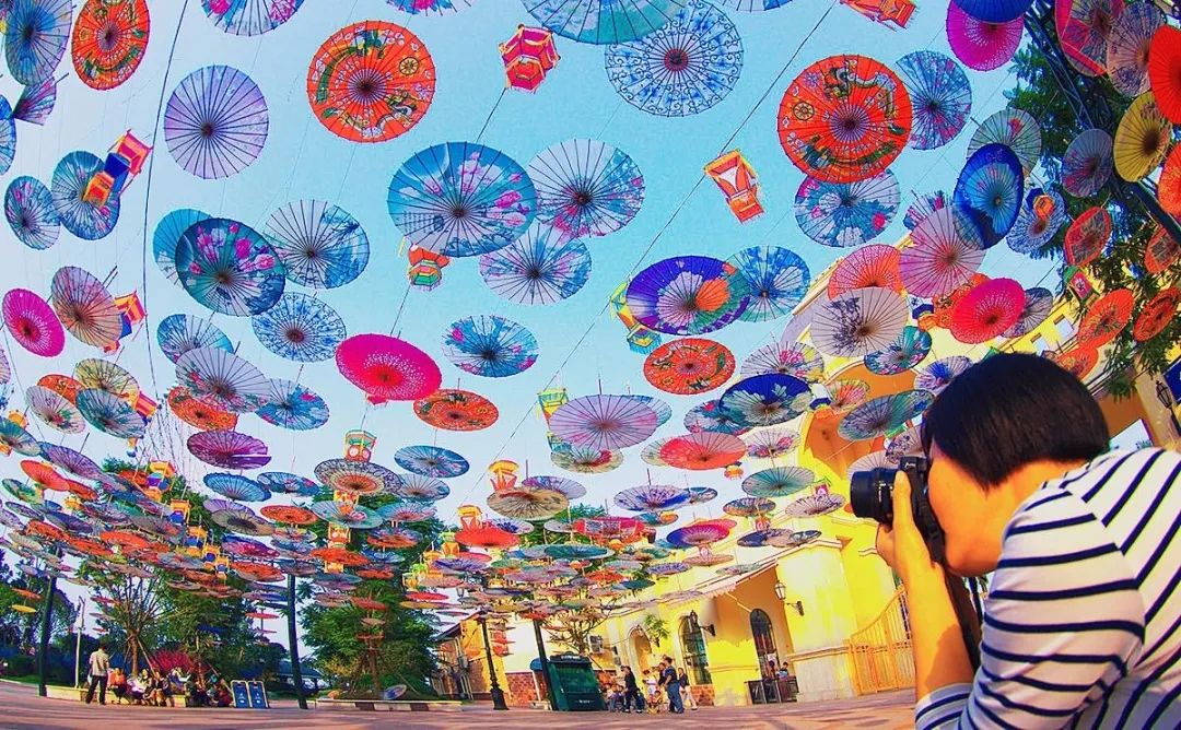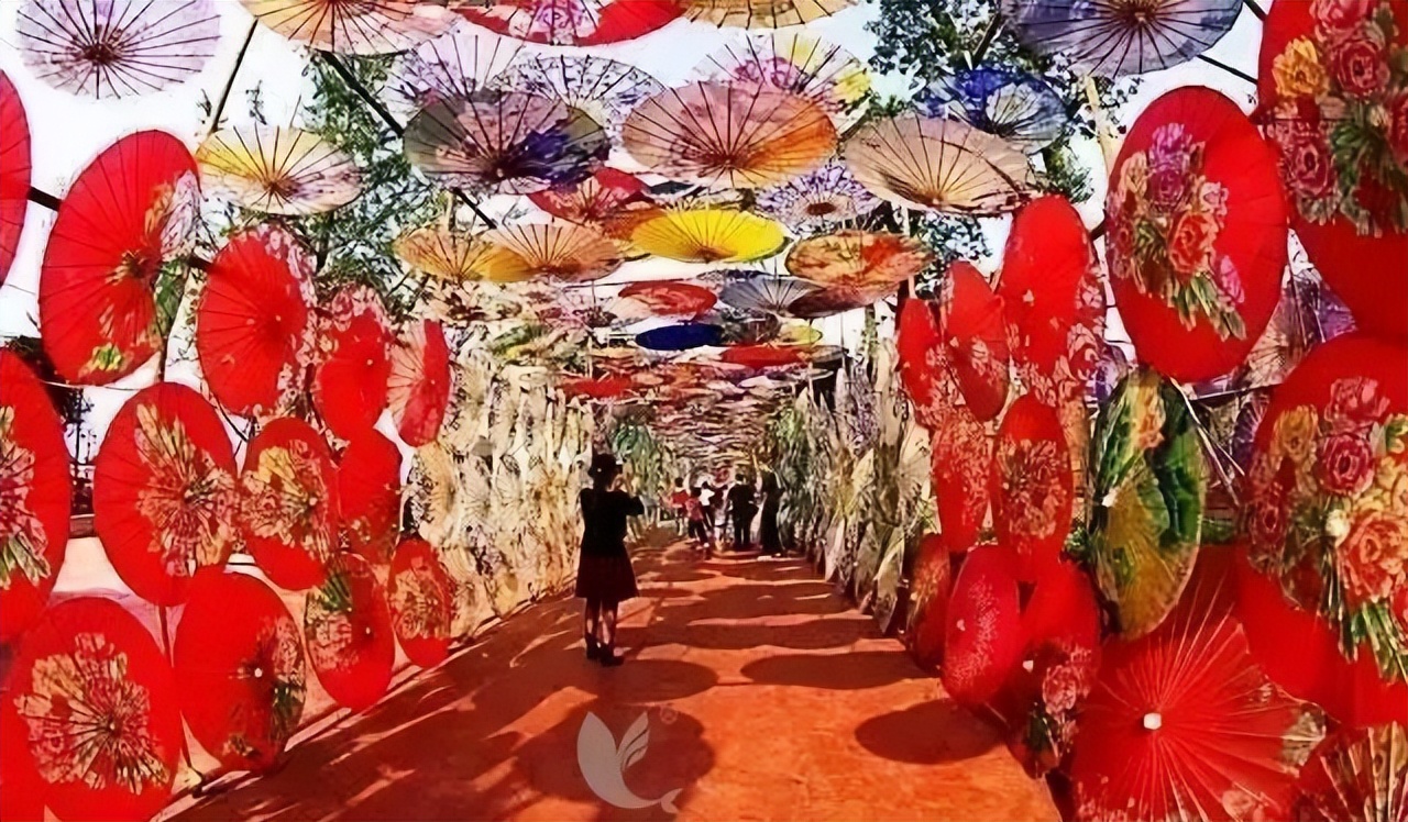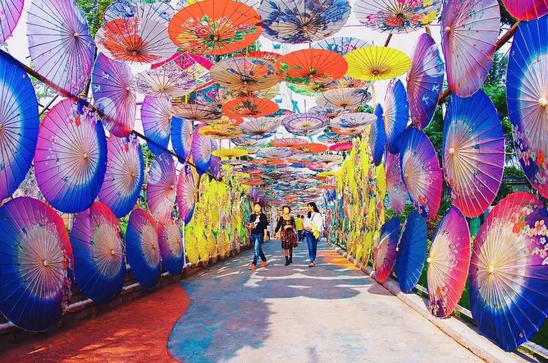 江南的油纸伞,很有诗意,油纸伞长廊也非常特别!小小油纸伞如倒立的蘑菇从天而降,妙不可言!
