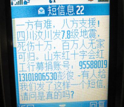 此外,还有一类虚假信息请大家特别要注意,就是所谓各种来源的假地震预报信息:如4月20日中午,就有一自称地震局内部人员的网民发帖散布谣言,称“4月20日芦山7级只是前震,成都将于4月22日发生9.2级地震。”成都警方及时查出造谣者,依据《治安管理处罚法》对其予以行政拘留。