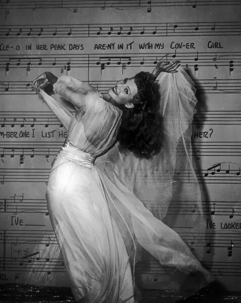 《封面女郎》是丽塔•海华丝与一代舞王吉恩•凯利联袂主演的一部歌舞片,这张照片捕捉到她在影片的宣传发布会现场,倚靠着一面印有片中歌曲的乐谱,所留下的妖娆倩影。在片中,她赢得了《名利场》杂志举办的封面女郎大赛冠军,而在现实生活中,她也是货真价实的“封面女郎”。她为《生活周刊》拍摄的照片也供不应求,她的海报受到在海外作战的美国大兵们的热切欢迎,甚至在第一颗用来做实验的原子弹上都印有他的照片。