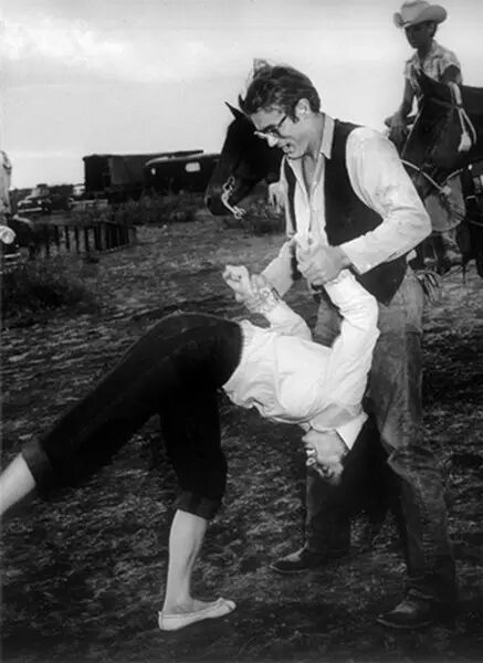 依然是泰勒,依然是迪恩在《巨人传》的拍摄现场。不知泰勒是否特别喜爱颠倒着看世界的感觉,这一次,紧握着她的双手帮助她完成这个动作的是好莱坞的新一代金童詹姆斯•迪恩。片中,迪恩疯狂迷恋着这个“长辈”,为此不惜打破一切的枷锁和禁忌。然而,泰勒在片中始终深爱自己的丈夫(洛克•哈德森饰),两人从未有过在这张照片中的亲密场景。