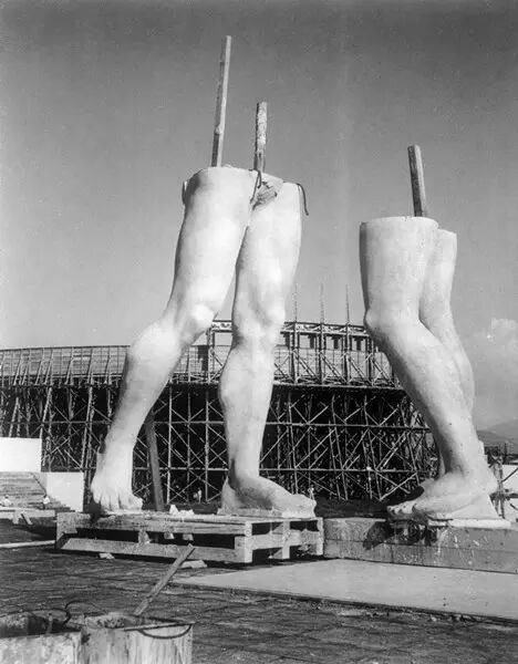 《暴君焚城录》是一部描述荒淫无度的罗马皇帝尼禄焚毁罗马城的暴行的宏大史诗片。为了还原罗马的盛景,米高梅当年动用了巨资搭建巨大的雕像布景,照片中的前方正是这些巨大的雕像建造到一半的情景,而后方已经成型的则是皇帝尼禄至爱的罗马大剧场。本片共计使用了令人震惊的32000套戏服,至今仍然无人超越。在整个50年代,好莱坞都陷入疯狂投资拍摄此类大型史诗片的热潮怪圈之中。