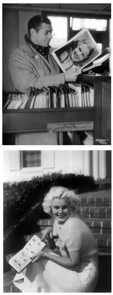 30年代红极一时的男女明星克拉克•盖博和珍•哈露互相怀有深深的仰慕之情。图中的盖博正在认真地欣赏着哈露的大幅照片,而哈露手里拿着的,正是她珍藏的印有各大明星手印的签名册,其中盖博的指纹和签名赫然在列。此外,还能找到琼•克劳馥和她自己的。