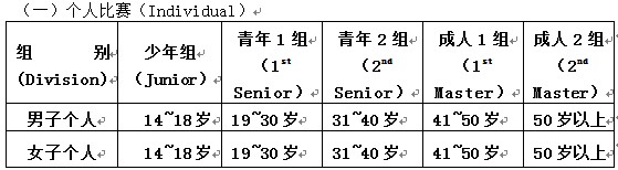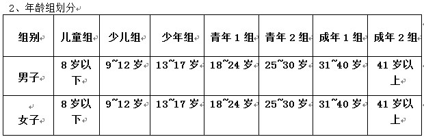 1、个人比赛一般在同年龄组运动员之间进行;必要时,可把相邻两个组别合并产生一个新的组别;任何运动员在一次赛事中只允许参加一个组别的比赛组。